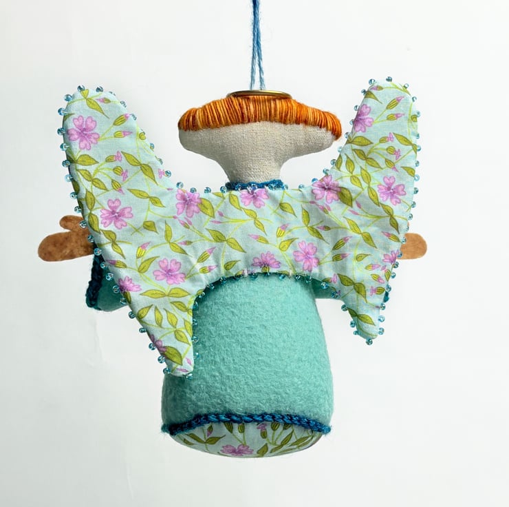 This is a handmade angel to be used as a hanging ornament or decoration. It has been made out of sky blue felt fabric and oatmeal linen/felt (for the flesh parts) and and all the facial details/hair are hand embroidered and the dress is hand stitched with a marigold design. She has a string attached to hang her with and she has cotton campion printed wings. The seams on the angel are trimmed with crochet and the wings trimmed with beads. She has a halo and she would love to make a Christmas visitation!