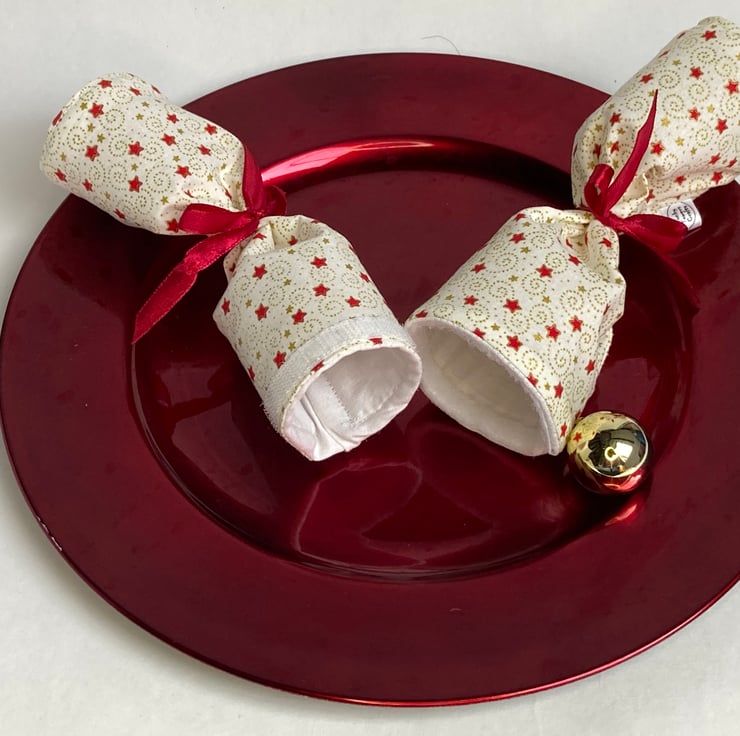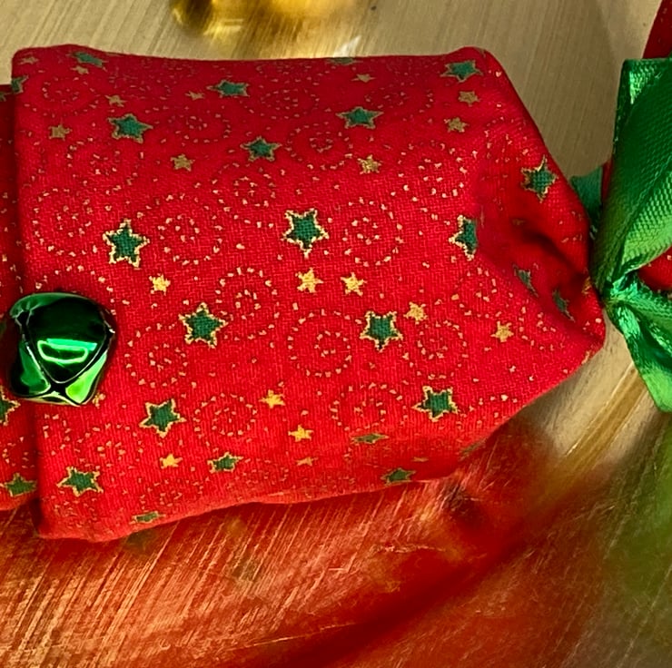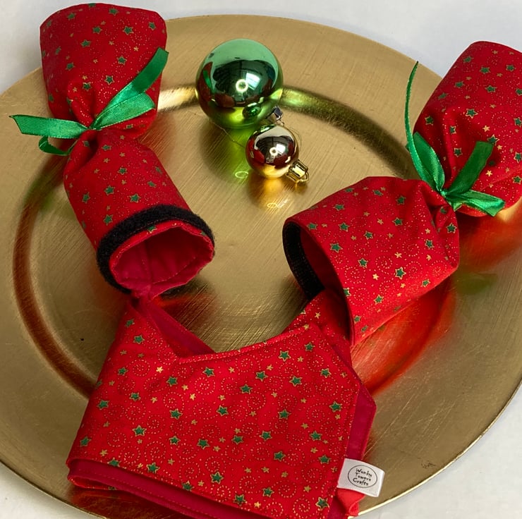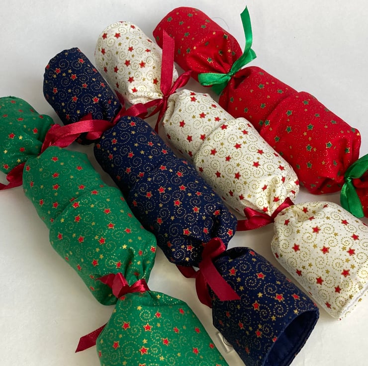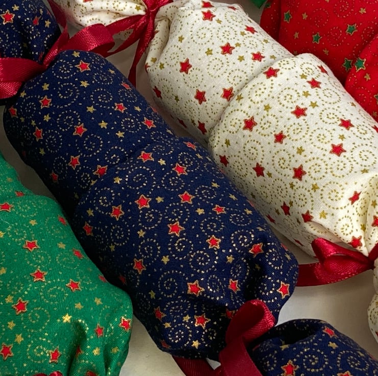 This listing is for a set of 4 crackers measuring approximately 30cm long. They are made from four different coloured fabrics (red, green, navy and cream) decorated with the same red and gold stars. Coordinating ribbons are used to tie the ends. Bells can be added as well, if you choose, for a small additional cost.