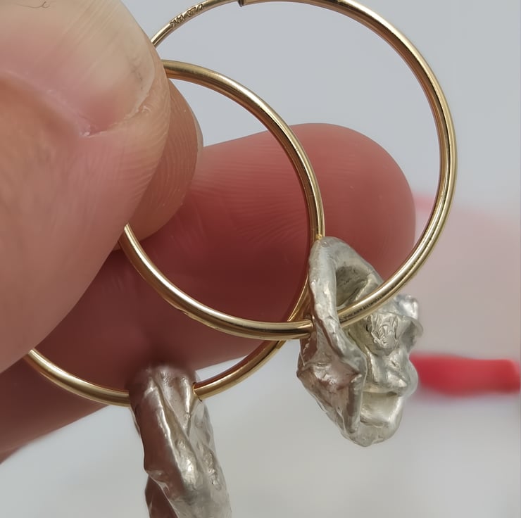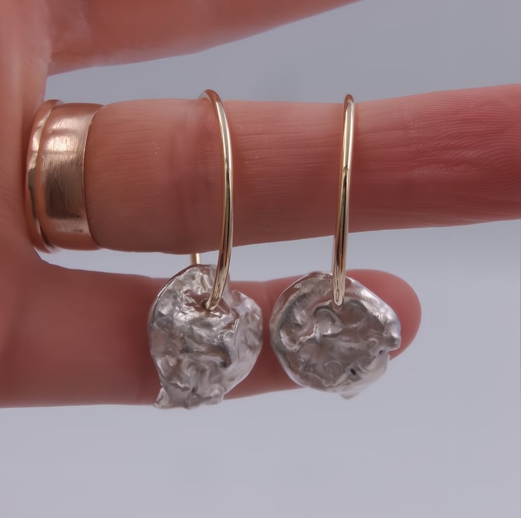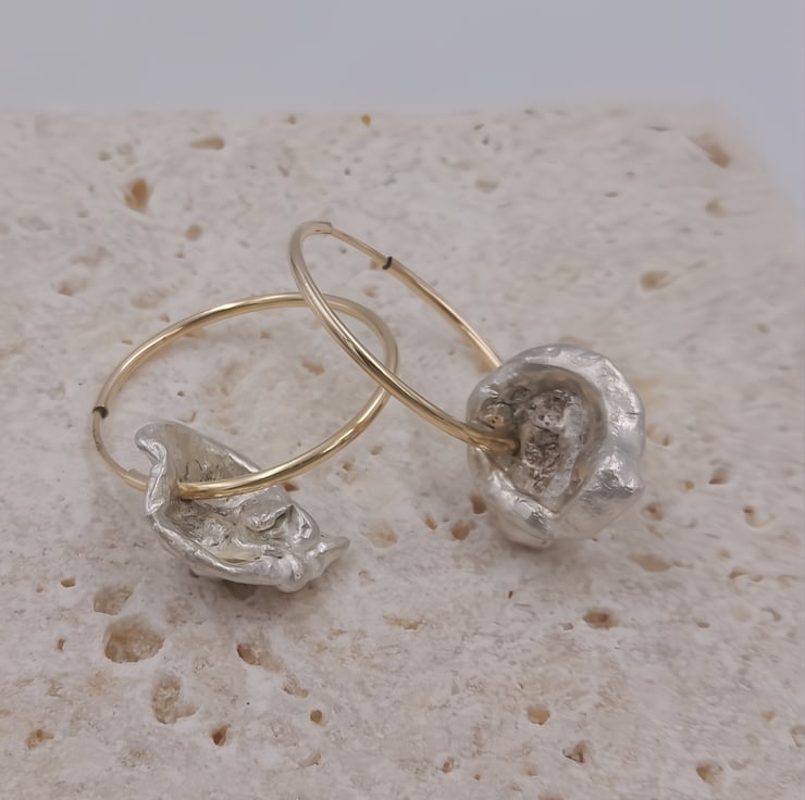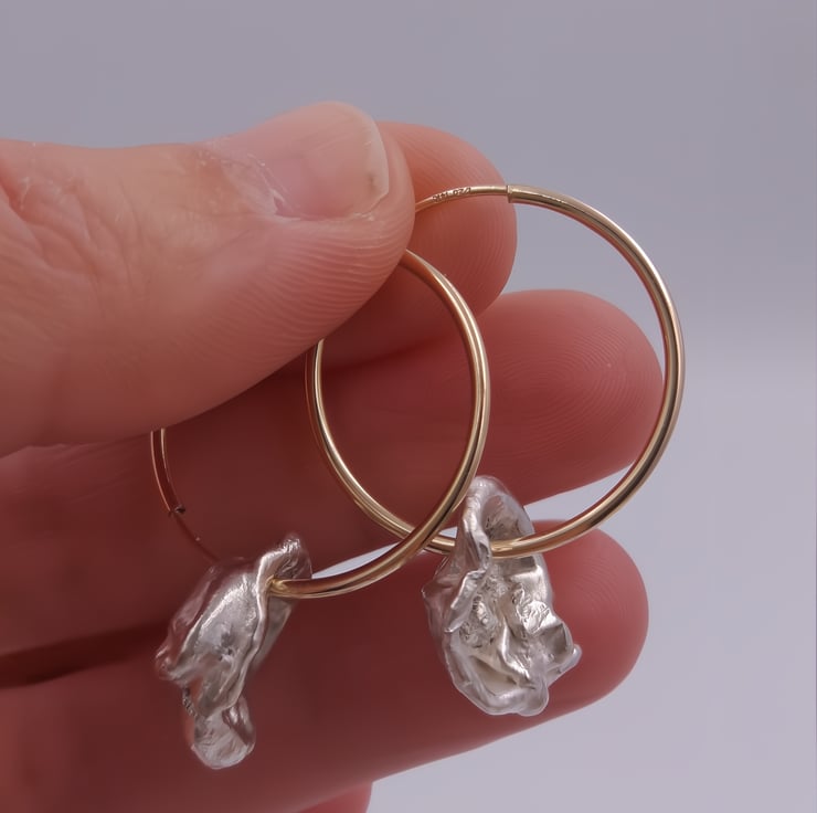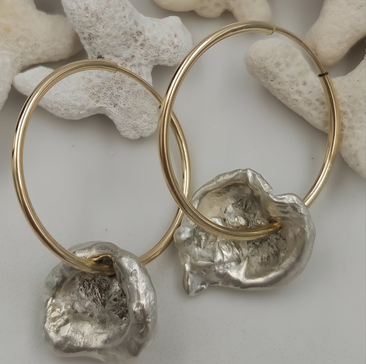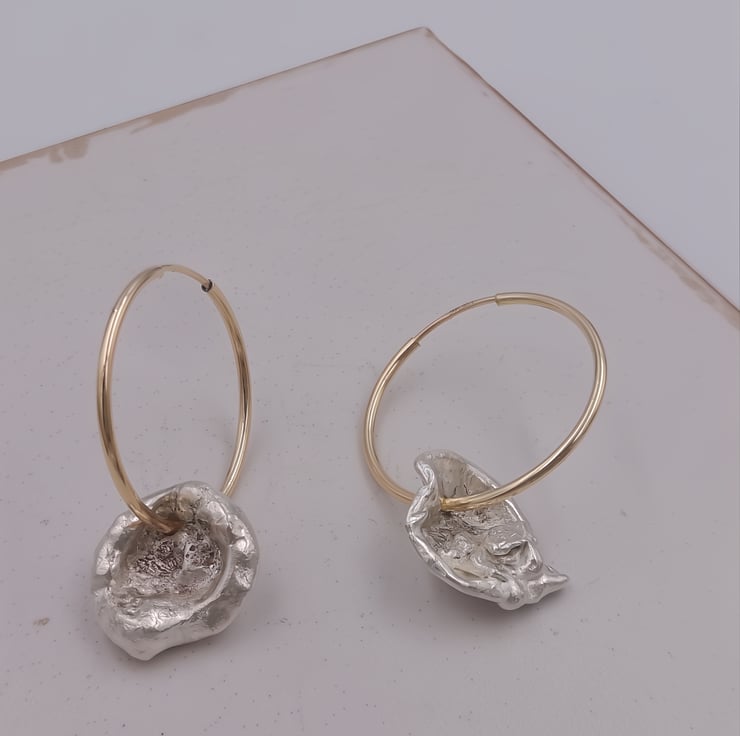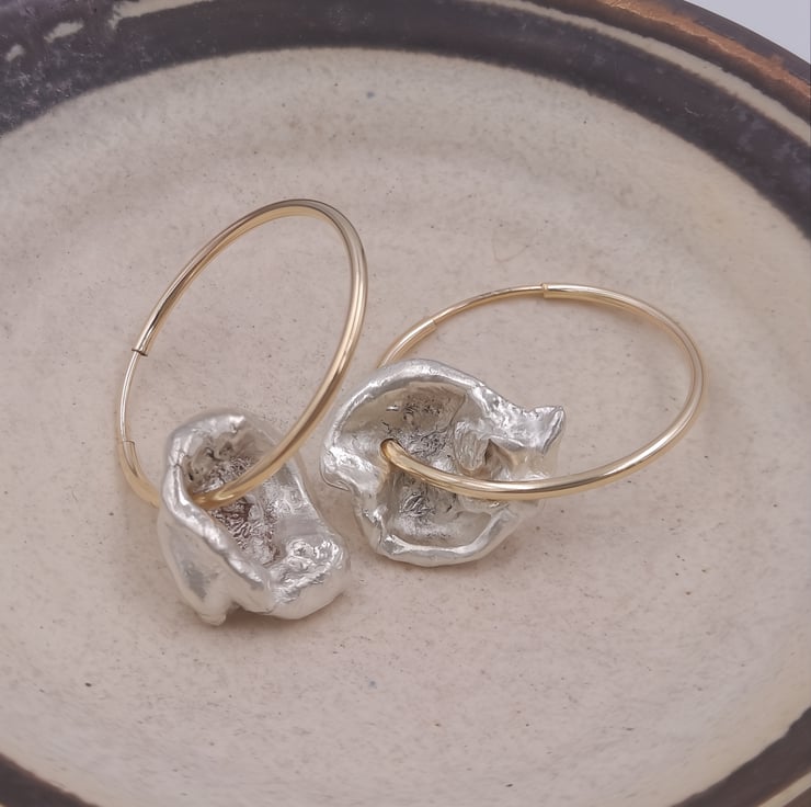 Gold Filled Continuous Hoop Earrings with Watercast Molten Silver Shell Detail