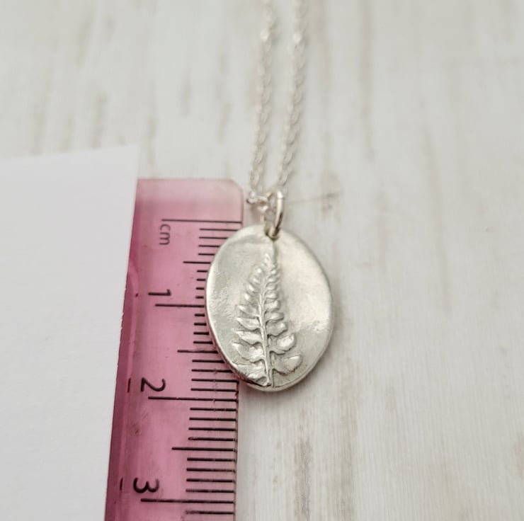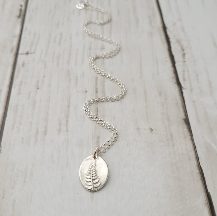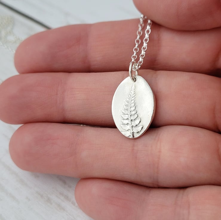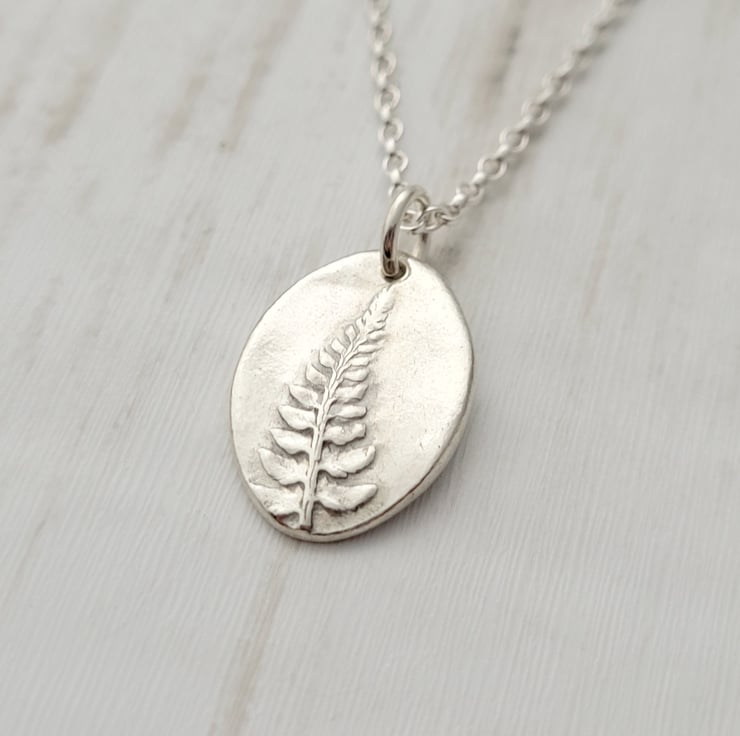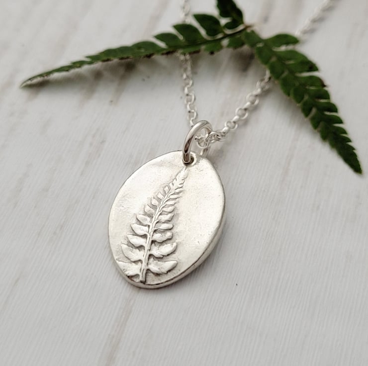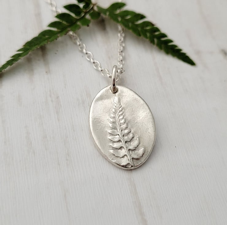 This stunning oval fern leaf pendant features the imprint of an actual fern leaf from my garden and is hand crafted from sterling silver making each pendant unique.