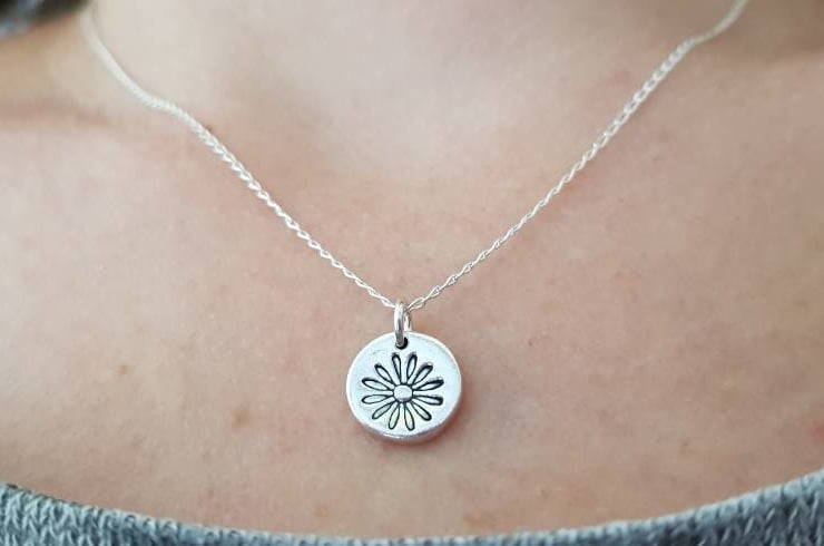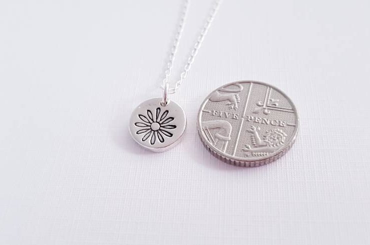 The tiny round daisy pendant measures approx. 1cm at the widest point.