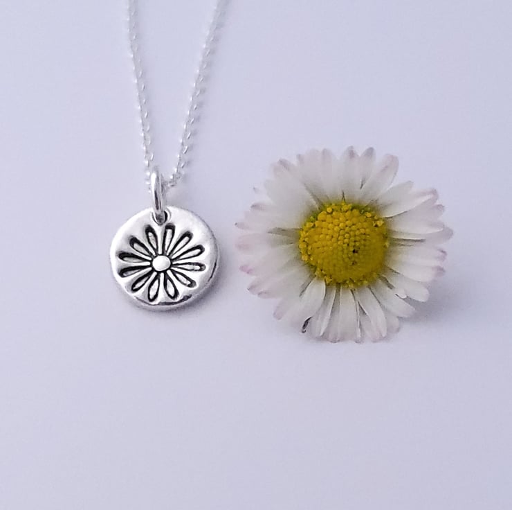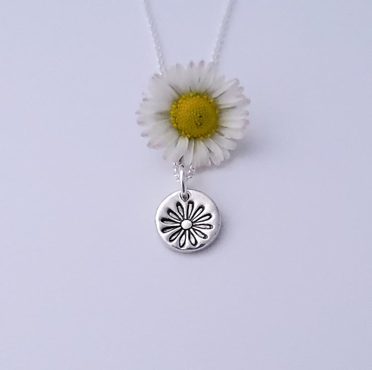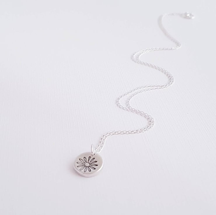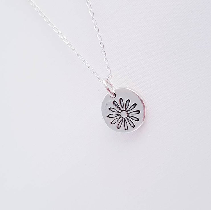 This pretty tiny round sterling silver daisy pendant features a stamped daisy design. The pendant is handcrafted from sterling silver and each pendant is unique.