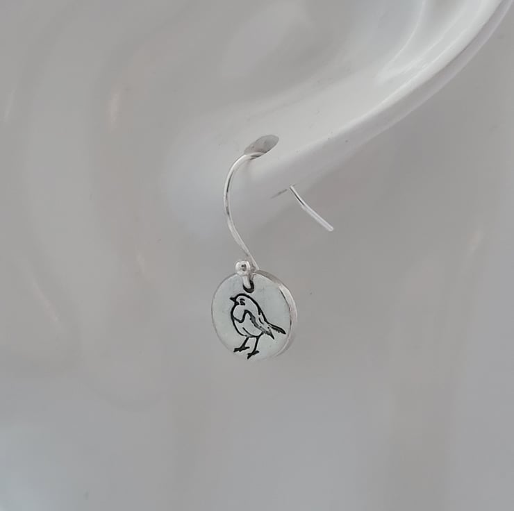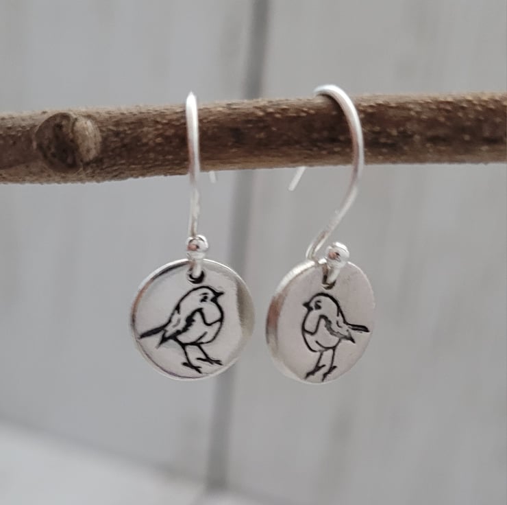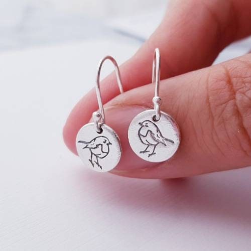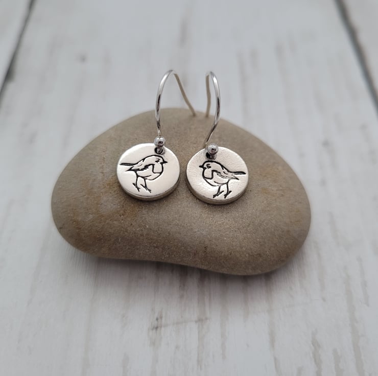 Pretty dangle sterling Silver robin bird earrings featuring my unique robin design on round charm dangle style earrings.