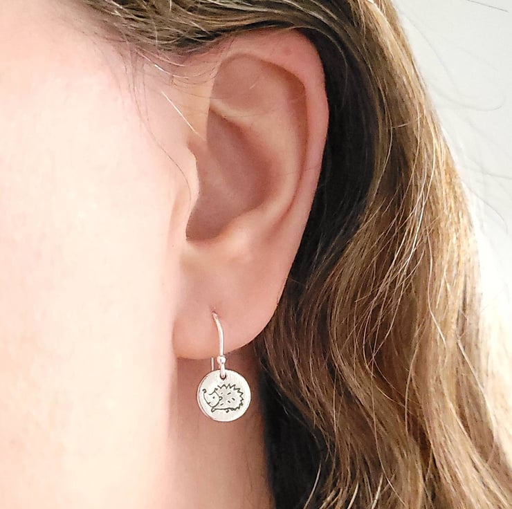 The finished hedgehog earrings are sterling silver & are attached to a sterling silver earring wires.