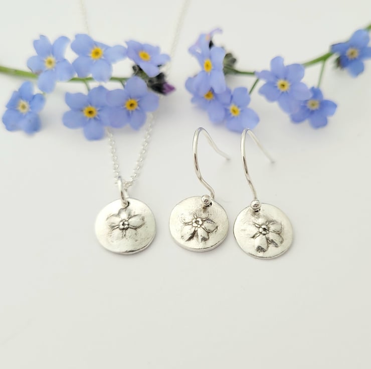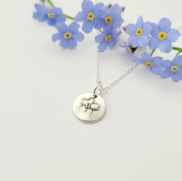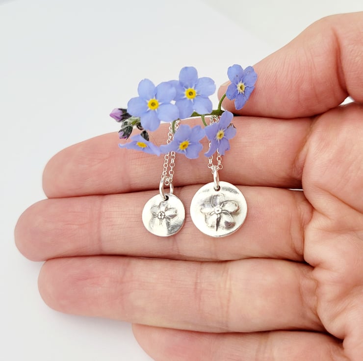 This beautiful tiny forget me not flower pendant features an actual forget me not flower imprinted in sterling silver.