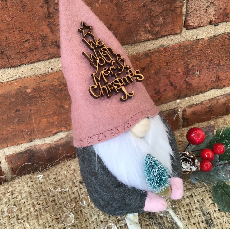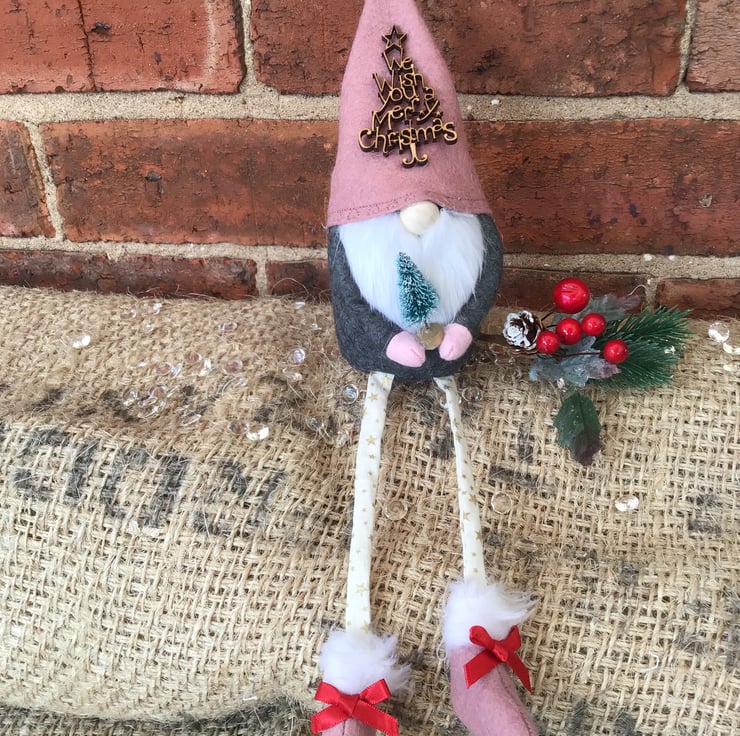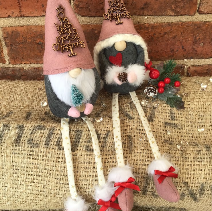 Wool viscose felt, mini gonk shelf sitter. Weighted at the bottom so they sit better, each Gonk has long legs with dusky pink felt fur trimmed boots.