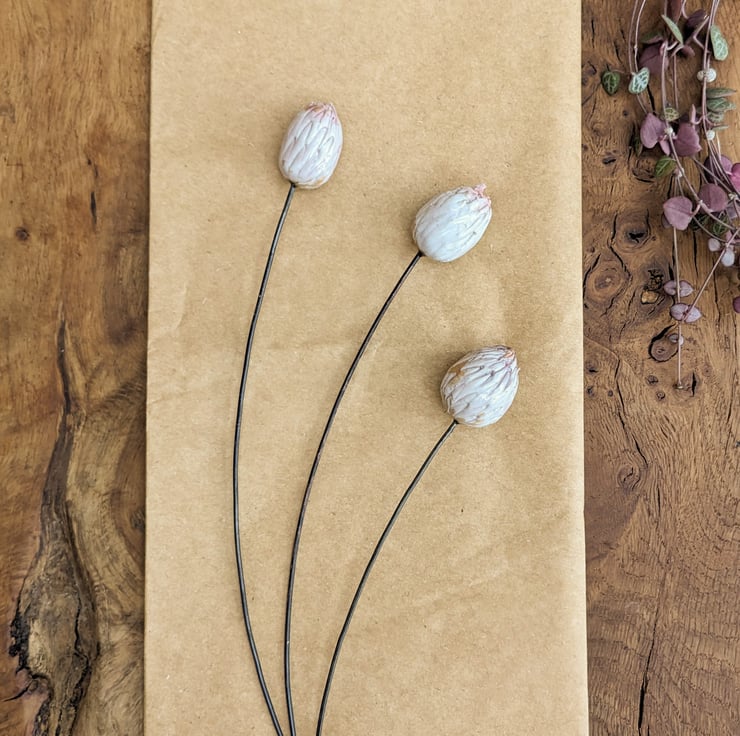 Set of three ceramic clover flower stems. Hand-sculpted in buff stoneware clay, sugared with red stain, fired, then glazed in the softest pink and re-fired. They are then affixed to wire and look beautiful displayed singly, grouped, or with my stained glass stems.