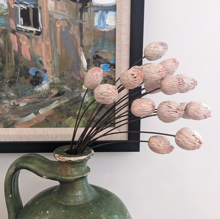 The stems are approx. 28 cm from top to bottom. Each clover flower is sculptured freehand to replicate the variation seen in nature; as such your stem will differ slightly from the photos shown here.