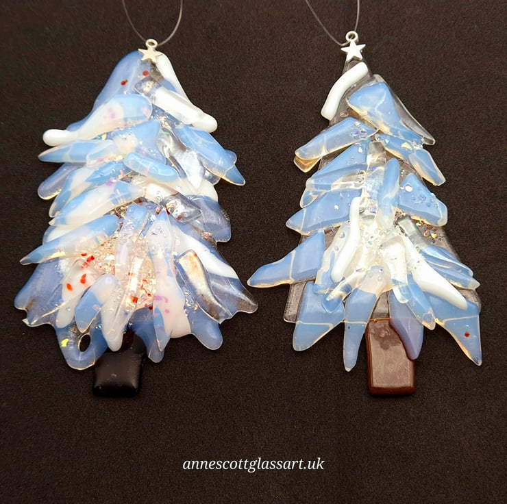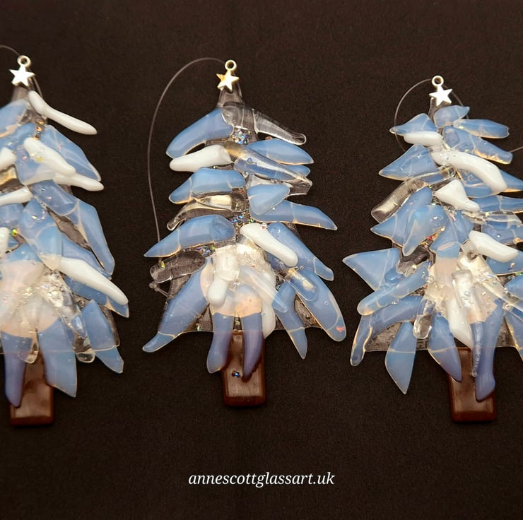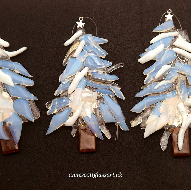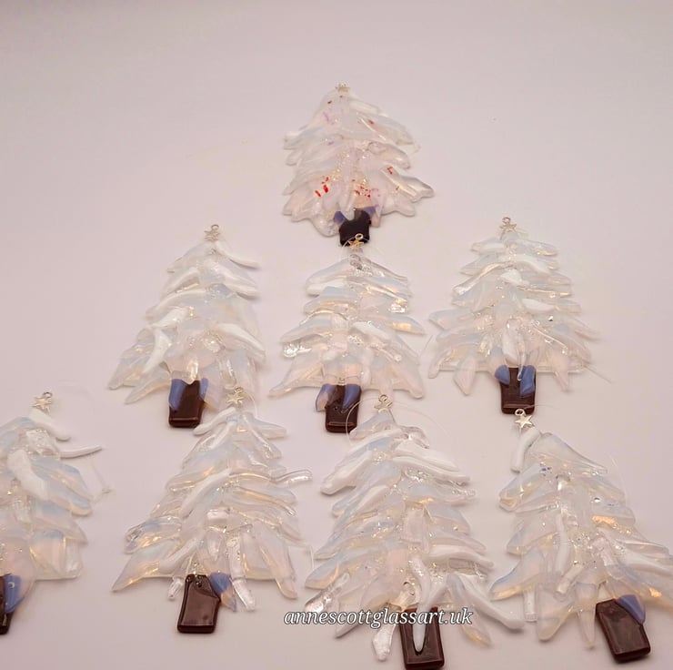Handmade fused glass Christmas tree decoration. These are made from clear, white, and opaline glass for the branches and brown glass for the trunk. A little bit of dichroic glass has been added to sparkle each piece. This is then tack-fused to give a 3D effect. A small silver-coloured star is glued on the top of the tree. And a thin, strong nylon thread is there for hanging. Due to the nature of fused glass, each piece is unique. these are approximately 12cm x 8cm x 9mm