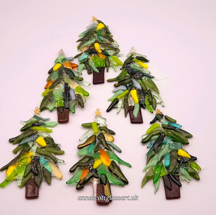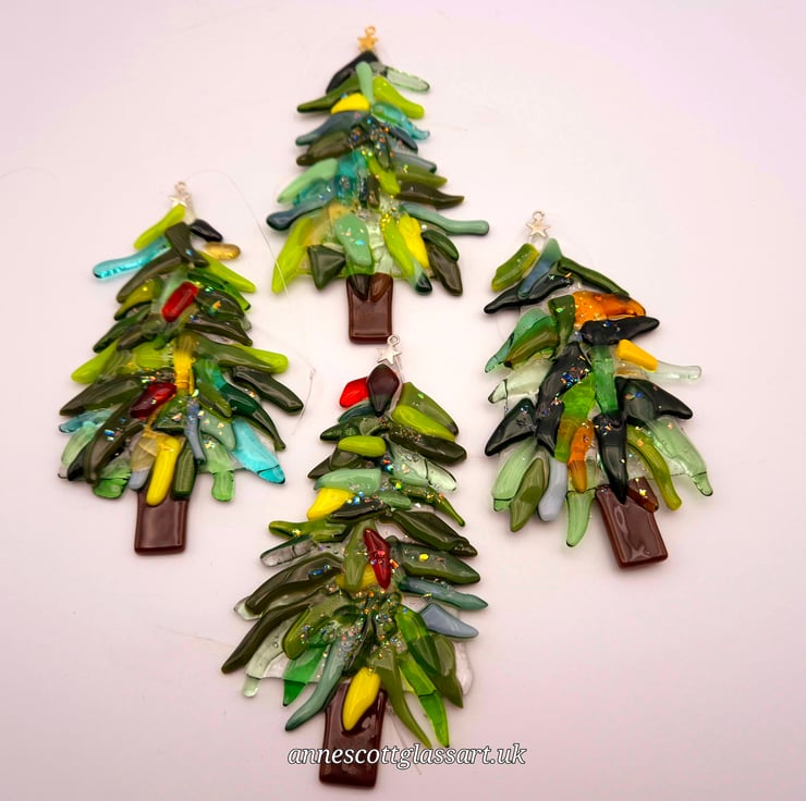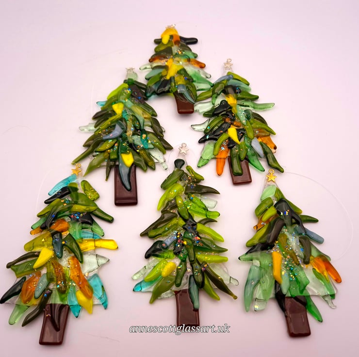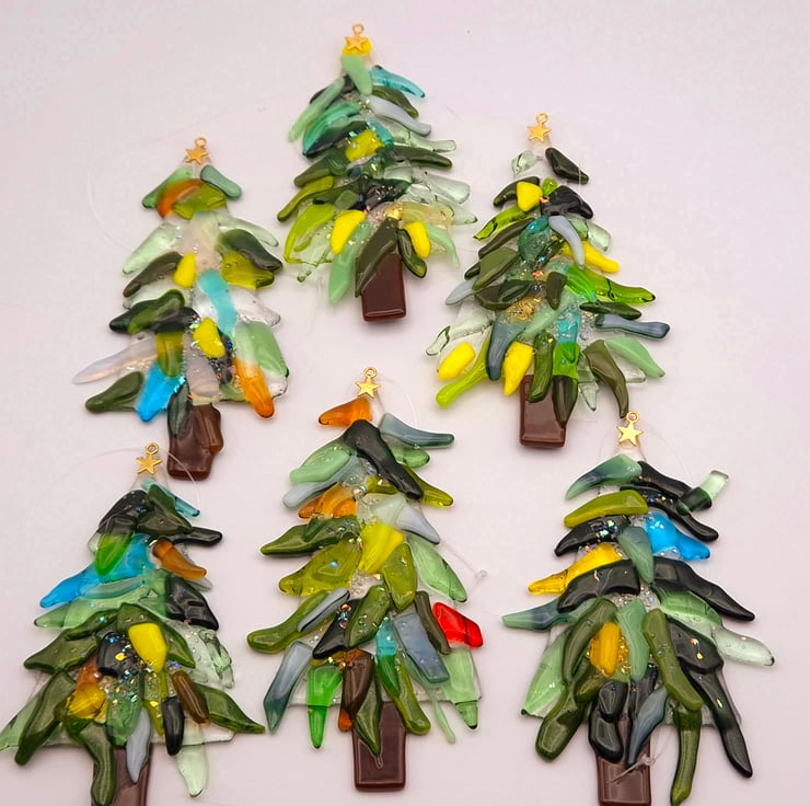 Handmade fused glass Christmas tree decoration. These are made from clear shades of green, red, yellow and blue glass for the branches and brown glass for the trunk. A little bit of dichroic glass has been added to sparkle each piece. This is then tack-fused to give a 3D effect. A small silver or gold star is glued on the top of the tree. And a thin, strong nylon thread is there for hanging. Due to the nature of fused glass, each piece is unique. These are approximately 12cm x 8cm x 9mm