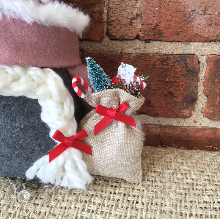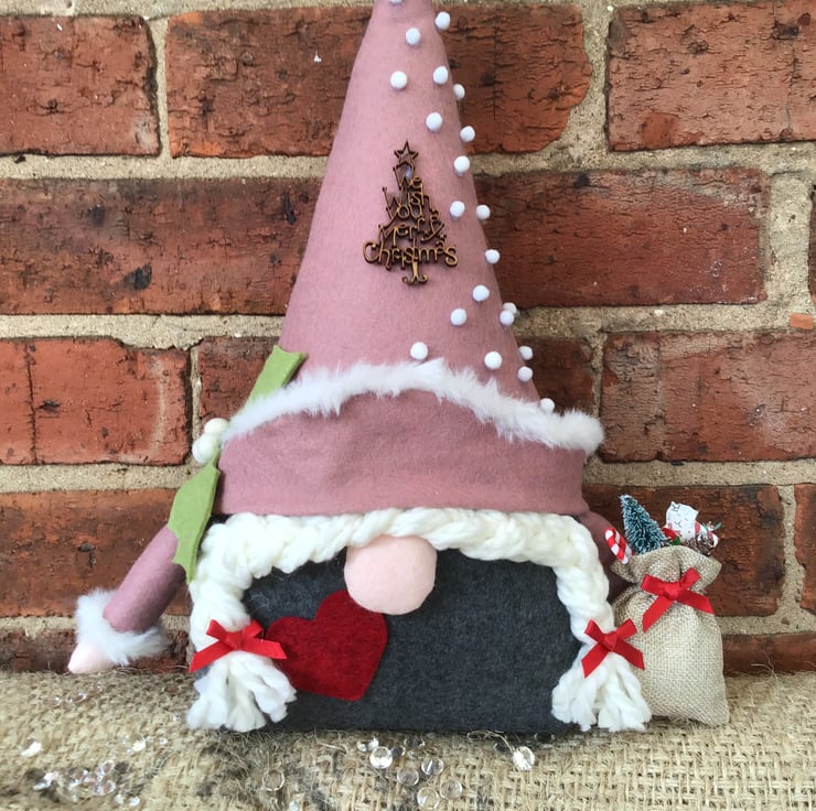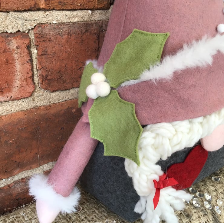 Handmade felt large Gonkess doorstop decoration. With a weighted bottom to help sit better this quirky decoration measures approximately 38cm rom the top of the bell on the hat to the base. Decorated with a wooden sign and mini pom-poms on the hat and holly and berries on the side of the hat. Also featuring a small Santa sack full of decorational goodies.