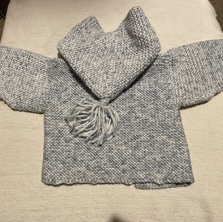 This cosy, fashionable handmade knitted cardigan has two blue buttons and a tassled hood. It is machine washable as wool. Measurements: 37cm chest, 20cm body length, 14cm arm length. Perfect for your little one or as a gift for a loved one.