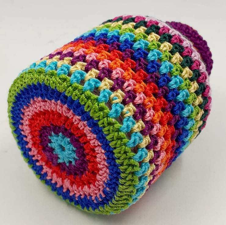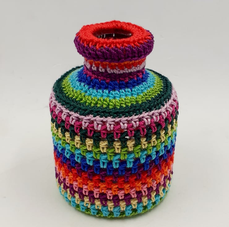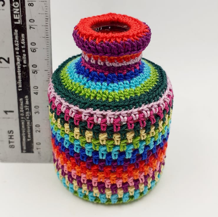 A labour of love for this tiny bottle! The cover for this repurposed glass bottle has been crocheted in fine cotton thread. Measuring approximately 7cm tall, it would make a pretty bud vase or a colourful ornament in its own right.