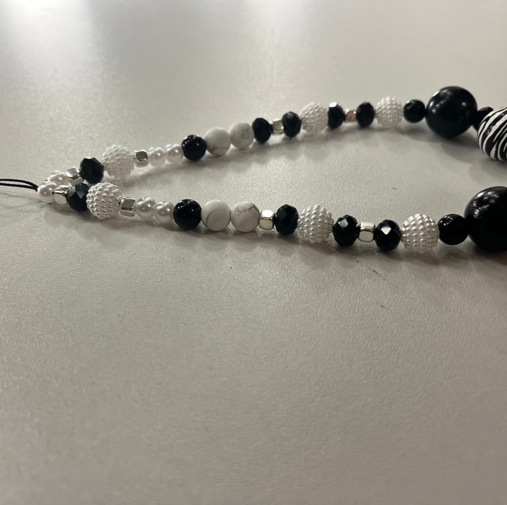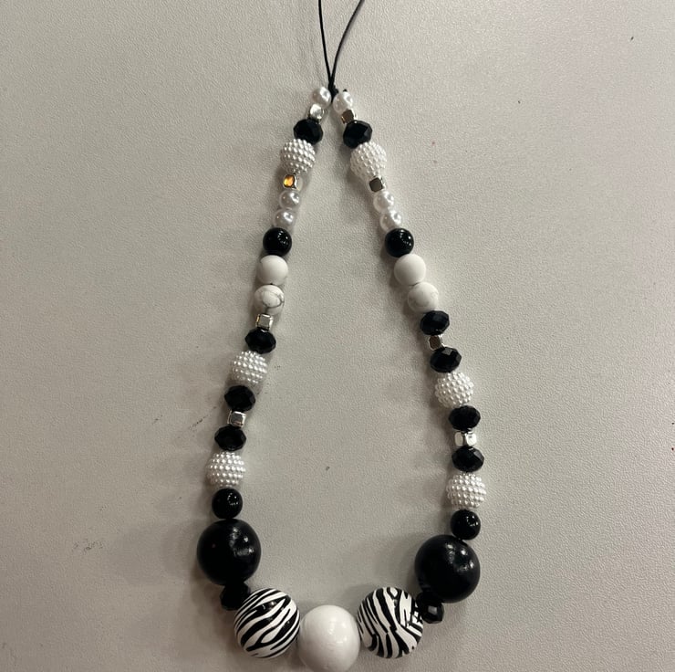 Unique and sophisticated animal print zebra black and white phone charm with silver trim.