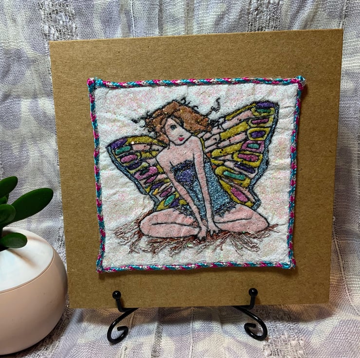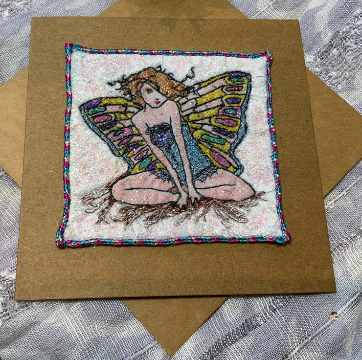 Hand painted and embroidered on a shimmer sparkle cotton background with a festive satin twine frame. Mounted on a golden brown card for rustic charm.