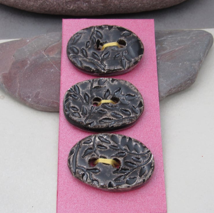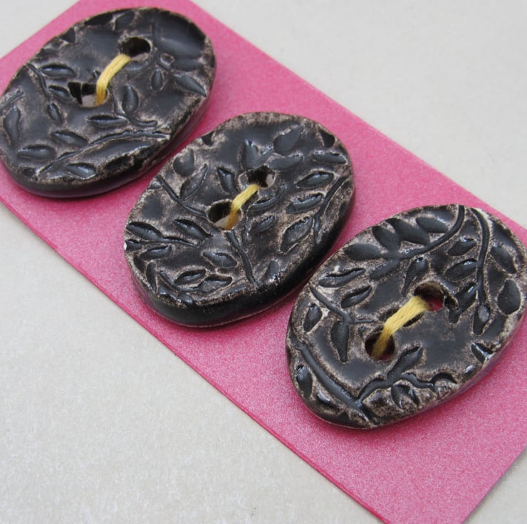 3 medium sized stoneware buttons, with a pretty leaf motif printed into the upper face. Finished with a dark brown semi-gloss glaze.