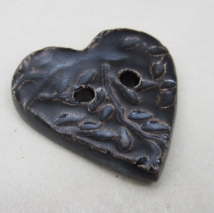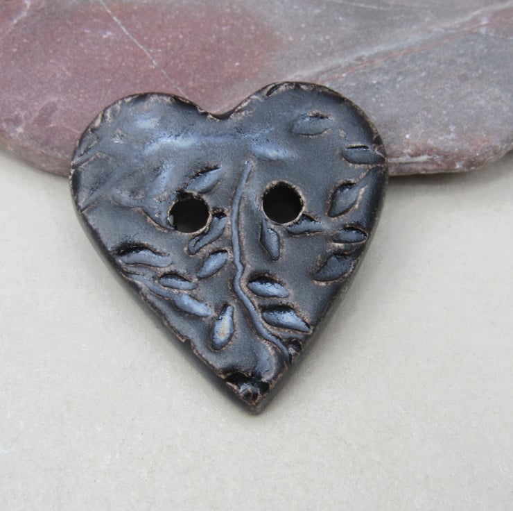 Medium heart shaped stoneware button, textured with a delicate leaf motif.