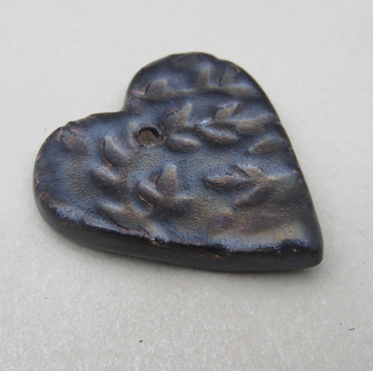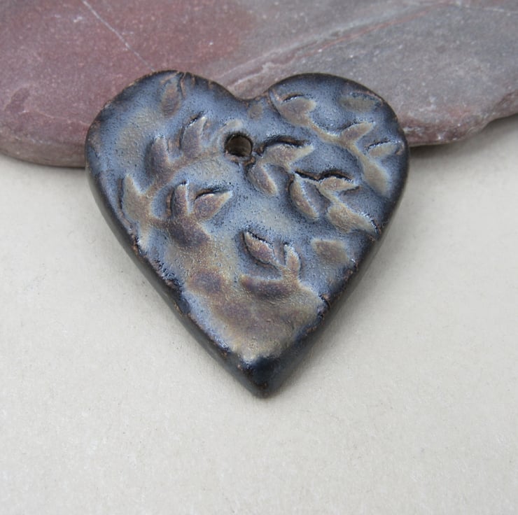 Medium heart shaped stoneware pendant, textured with a delicate leaf motif.