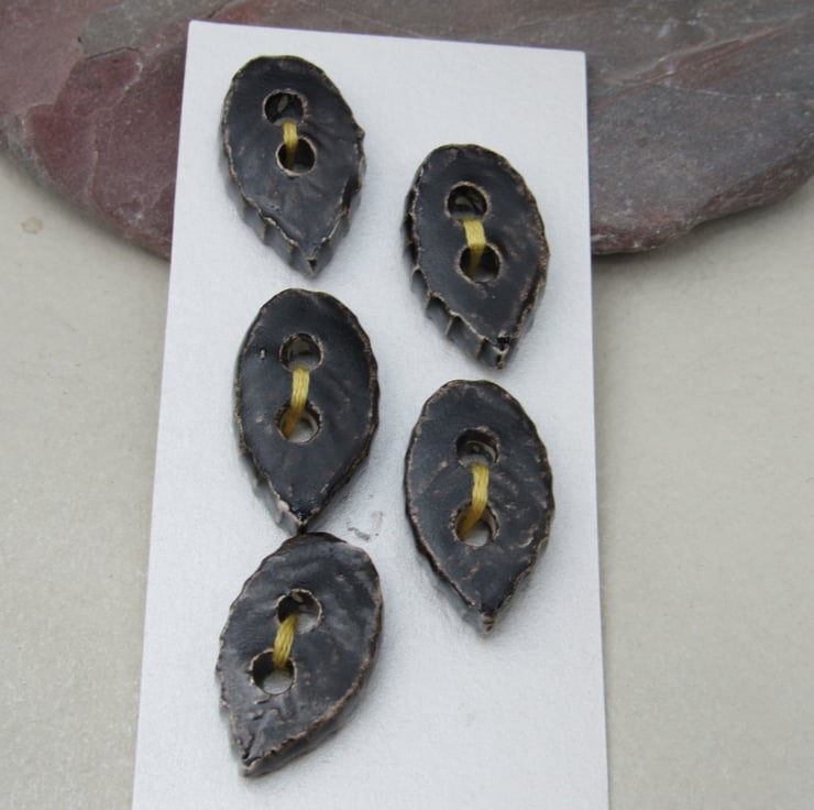 5 small stoneware buttons cut to a toothed leaf shape and finished with a dark brown semi-gloss glaze
