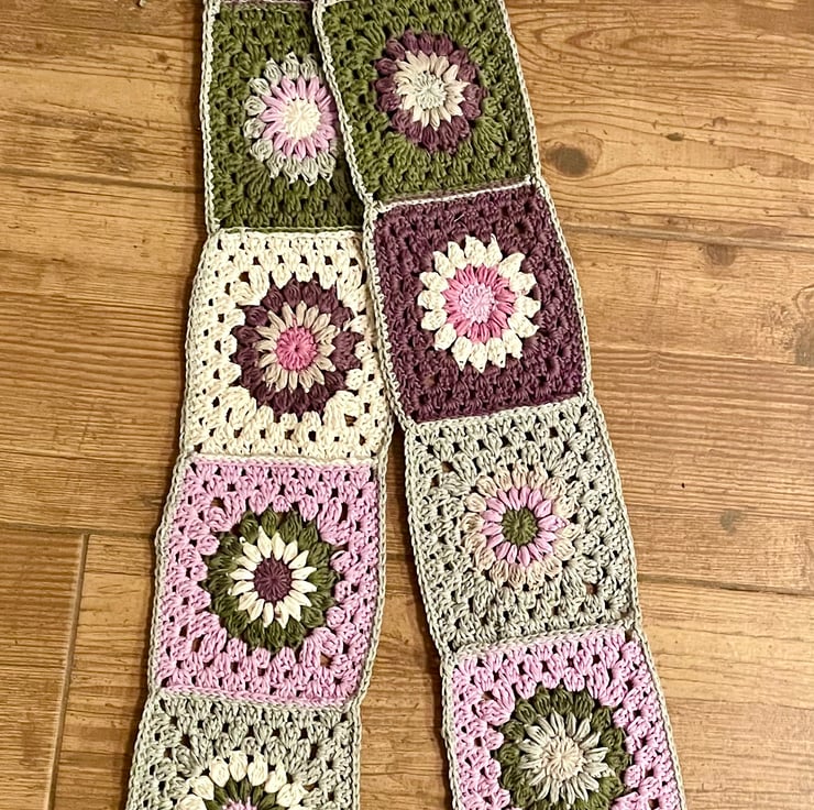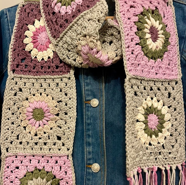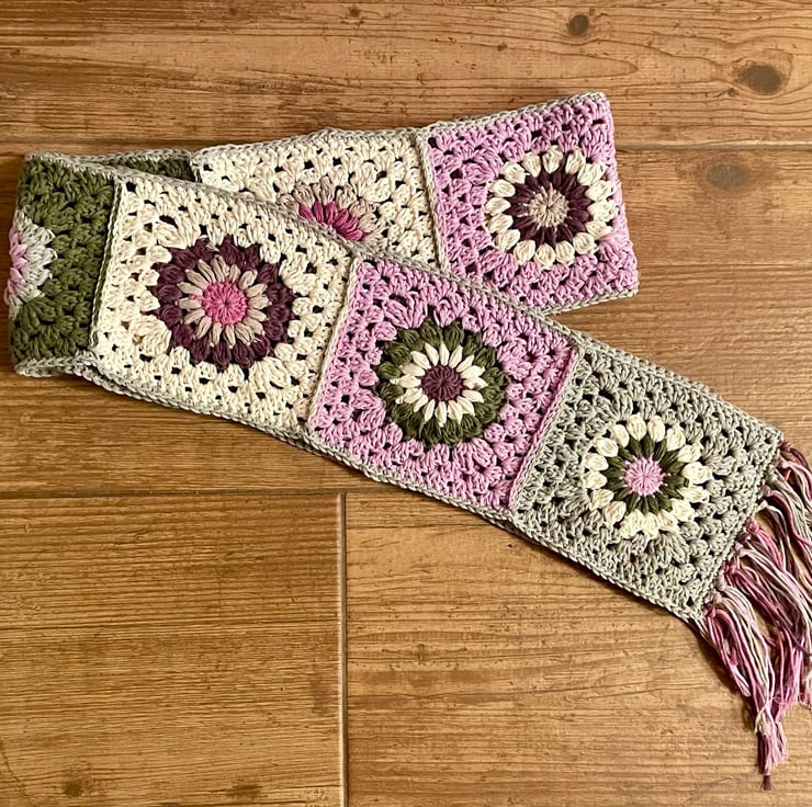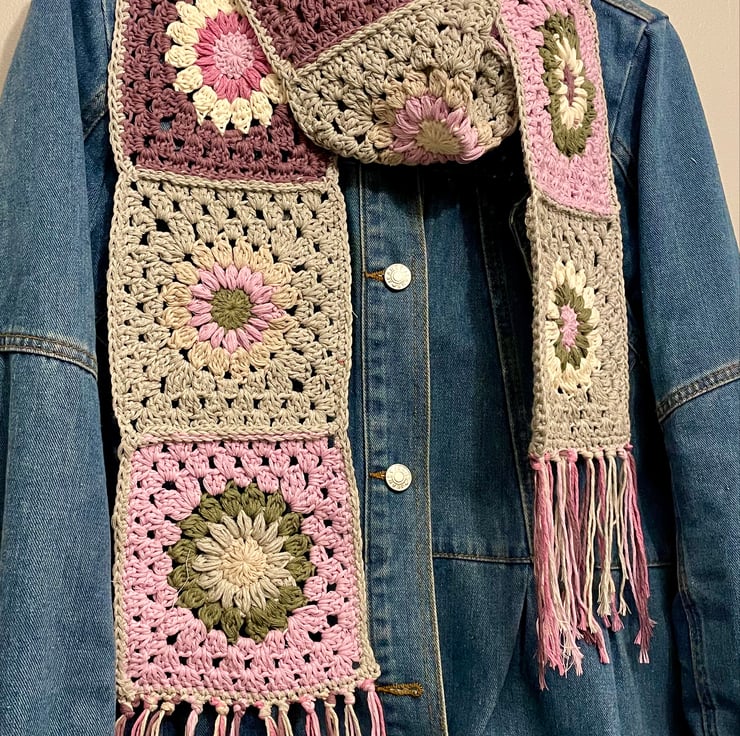 I enjoy making starburst granny squares and I love the feel of this yarn… so soft and warm. Was inspired by some much more expensive granny square scarves sold on the high street and know I could make one much more affordable.