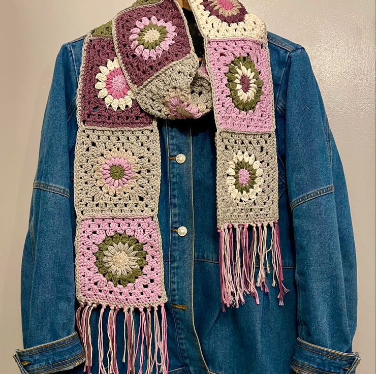 This Boho Granny Square Scarf created with 12 crocheted starbursts granny squares in a combination of purples, pinks, grey, green and off white colours in a cotton blend yarn which makes for a soft and warm retro accessory that is on trend this year. You see them on the high street but this one you know is made in England… more specifically Yorkshire which has a long history of textile creations.