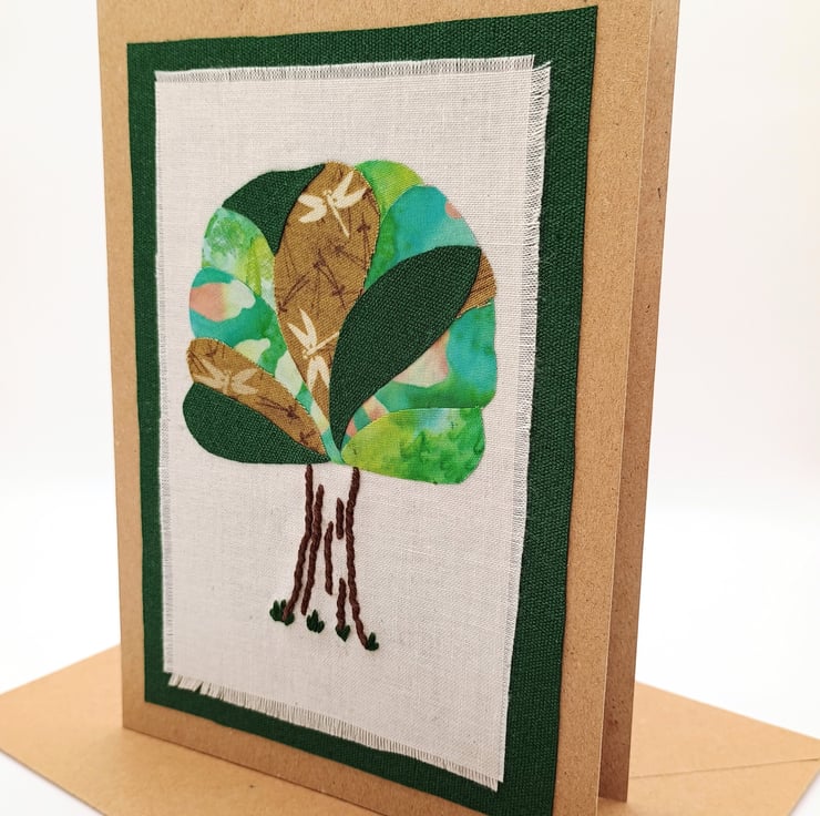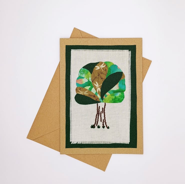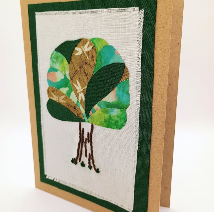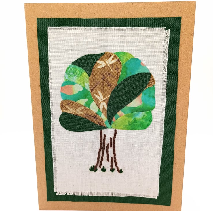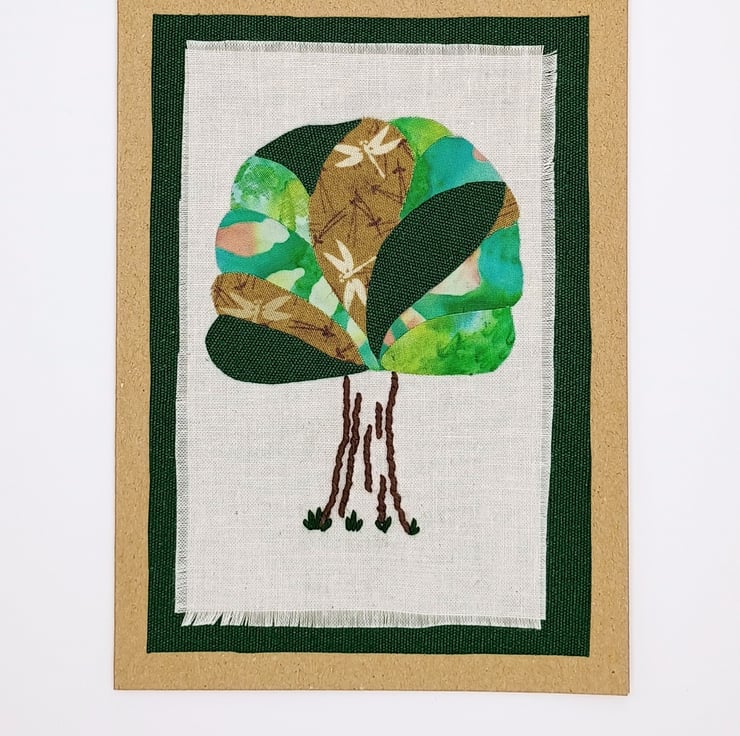 Differing fabrics of greens and browns are layered, onto calico, to make the crown of the tree with the trunk detail embroidered by hand. A complimentary green fabric border completes the image.