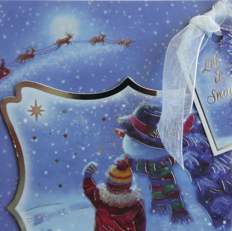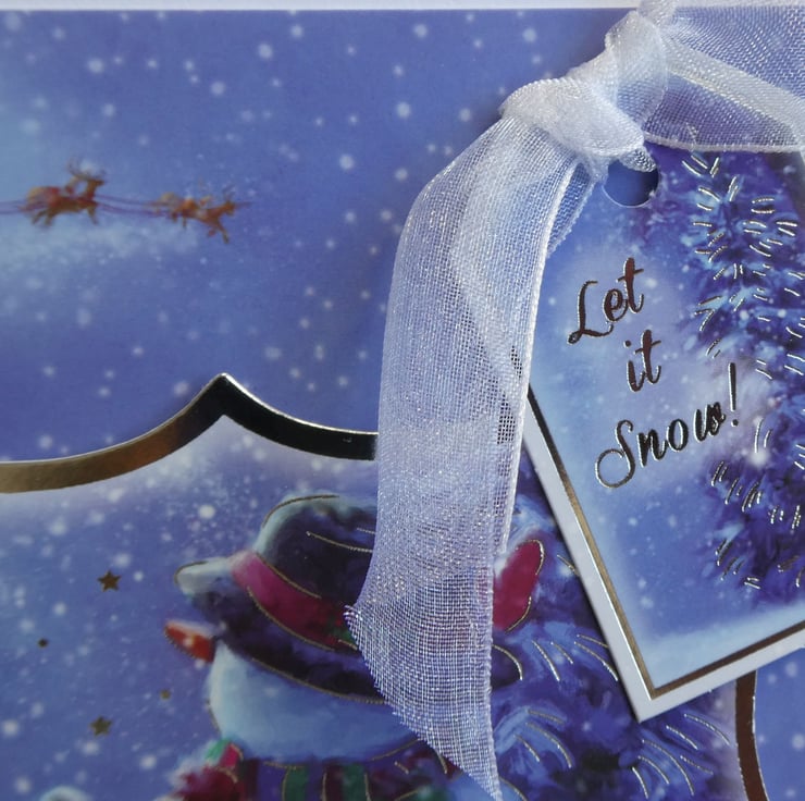 A tag shaped message with the greeting Let it Snow! has been added in the top right corner, tied with white organza ribbon.