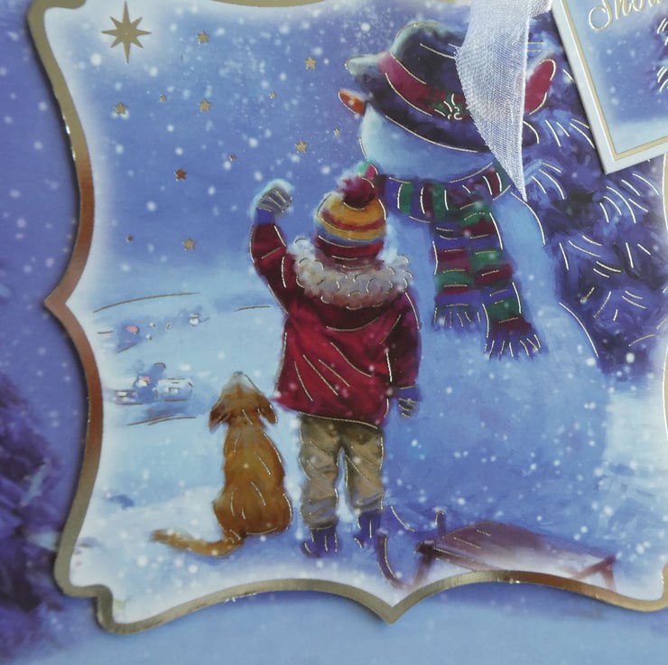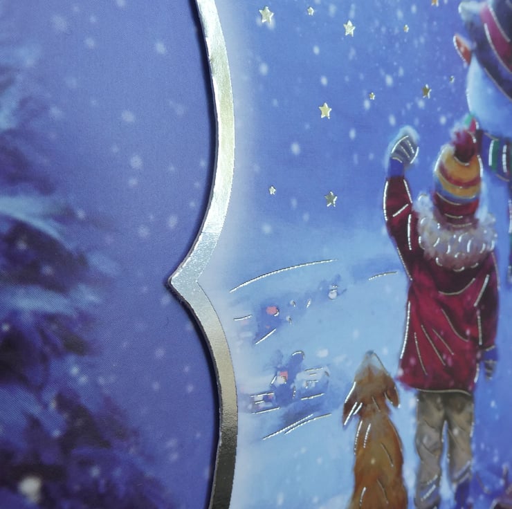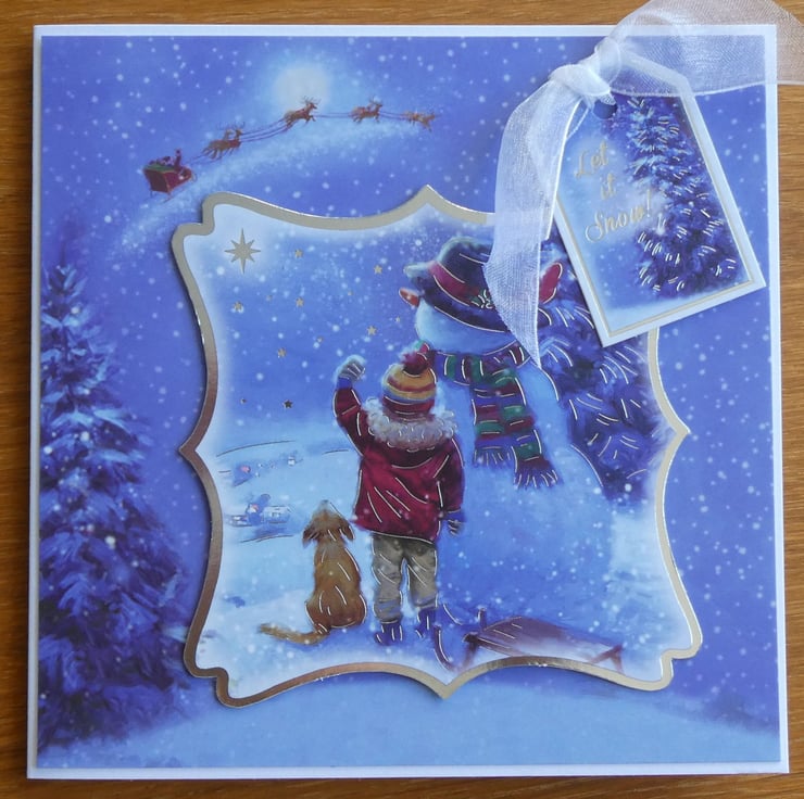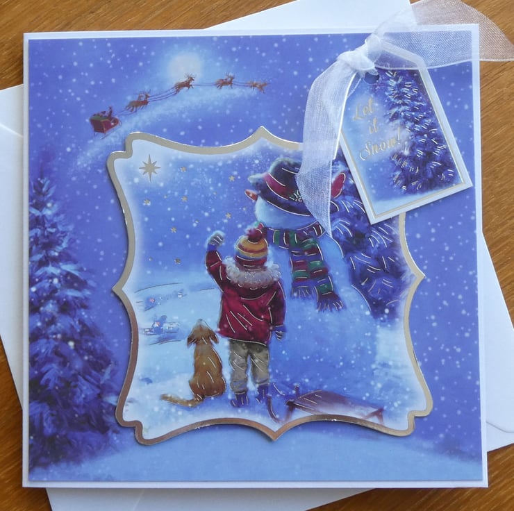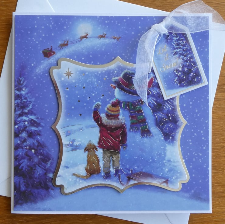 The front of the card has a background showing a snowy night scene with Santa flying overhead in his sleigh printed onto quality gloss card. A fancy edged square card topper shows a small child with a dog and a snowman waving towards Santa's sleigh.