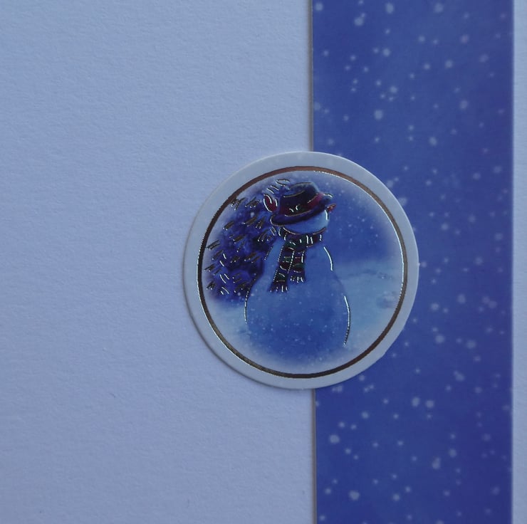 To finish the card a strip of blue snowy card has been added down the right hand edge inside the card, topped with a small circular image of a snowman.