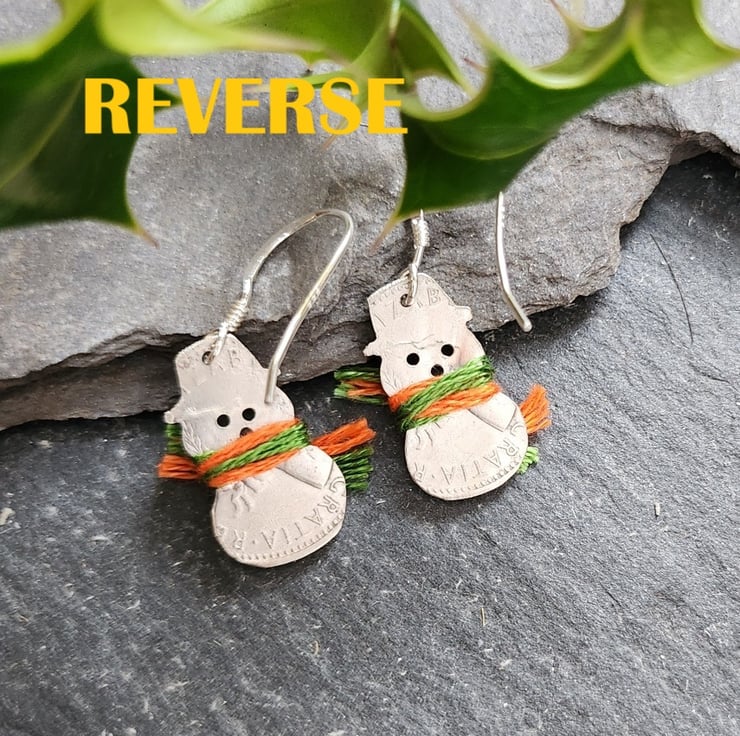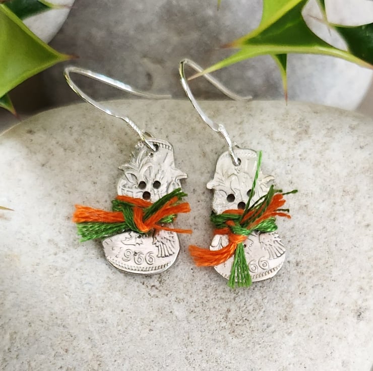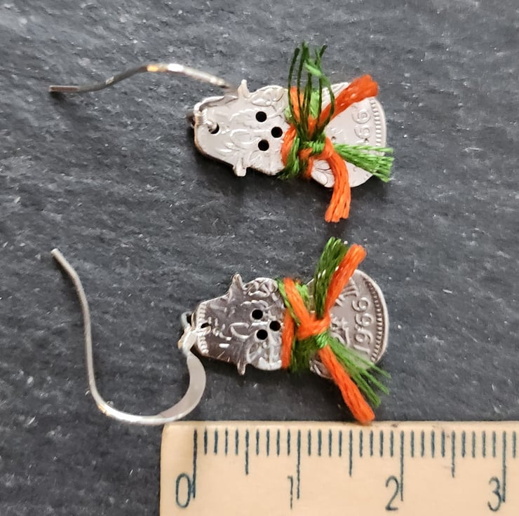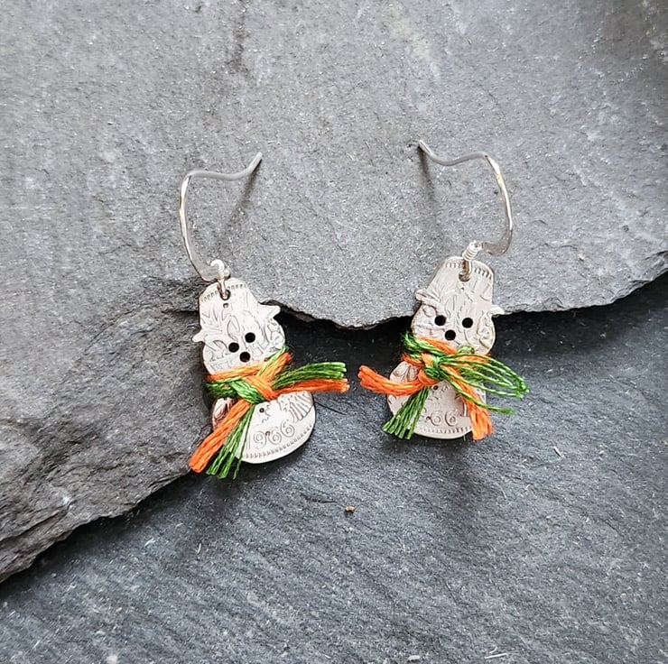 1966 sixpences handcut into snowmen, using a fine-bladed jewellers saw. Just under 2cms tall. 2 strands of coloured embroidery silks tied around neck to make a scarf. Finished with sterling silver ear wires.
