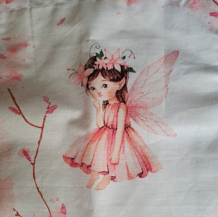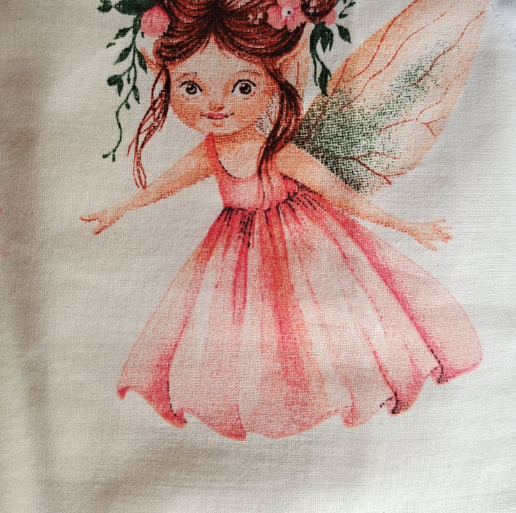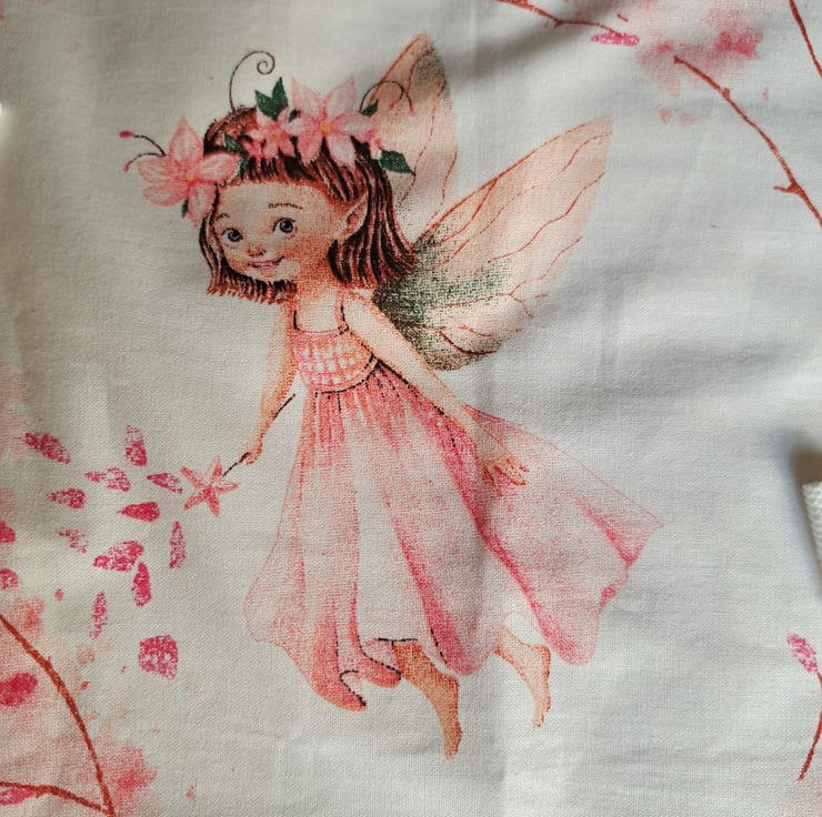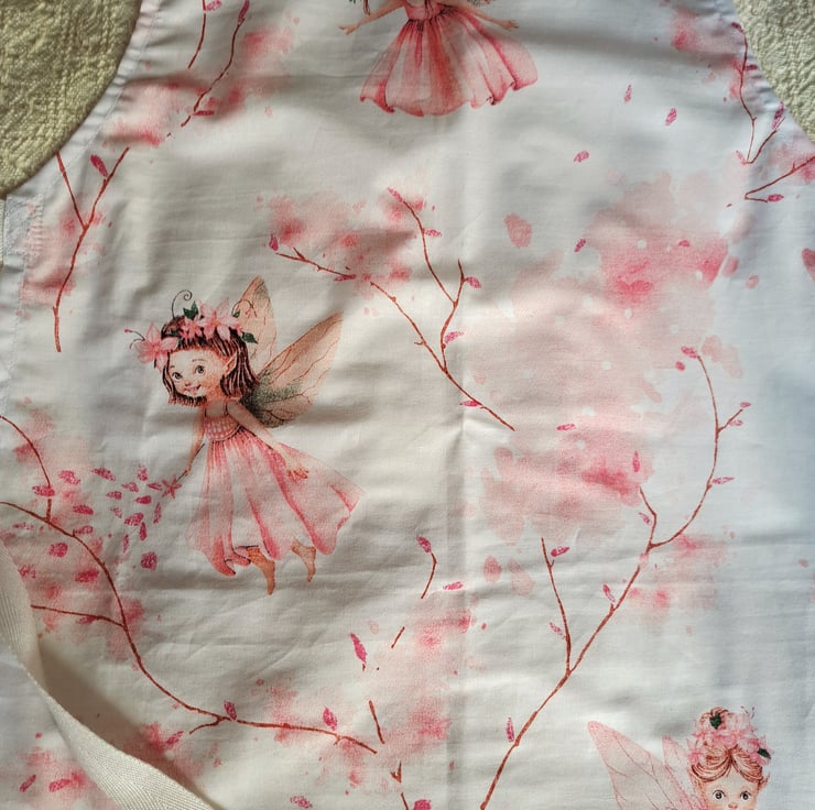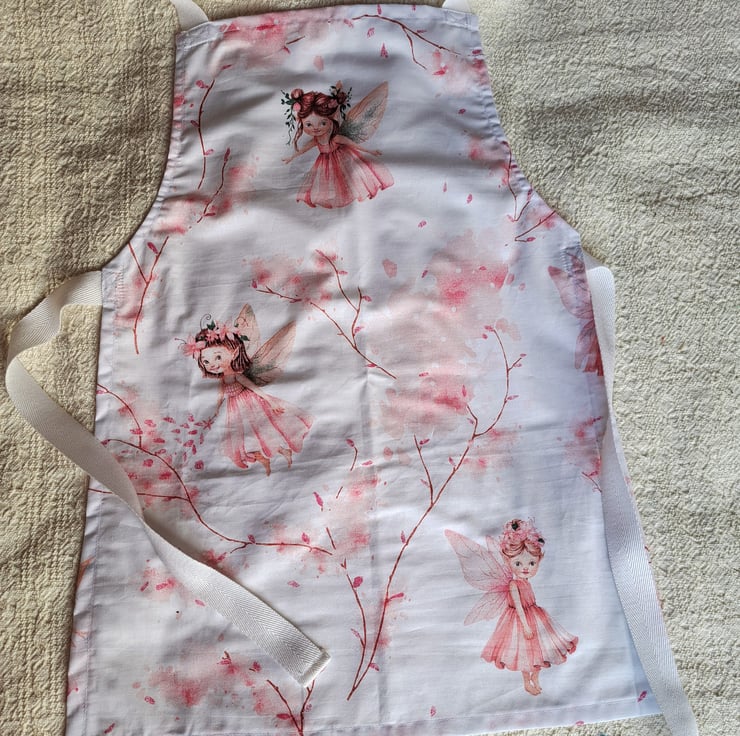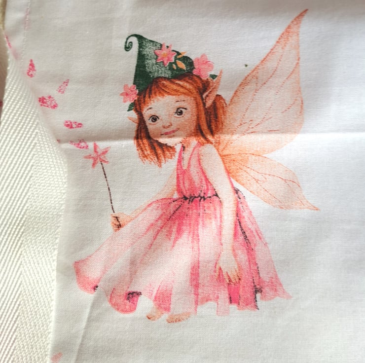 I have made these aprons from a lovely cotton quilting fabric, printed with pretty pink fairies cavorting among the blossoms. (They may not appear in the same places as in the illustrations.) The aprons measure approximately 22" (56 cm.) from neck to hem, and 17" (43 cm.) at the widest point. They will fit a child from roughly six to ten years. The straps are acrylic herringbone. Being good quality cotton the aprons can be machine washed.