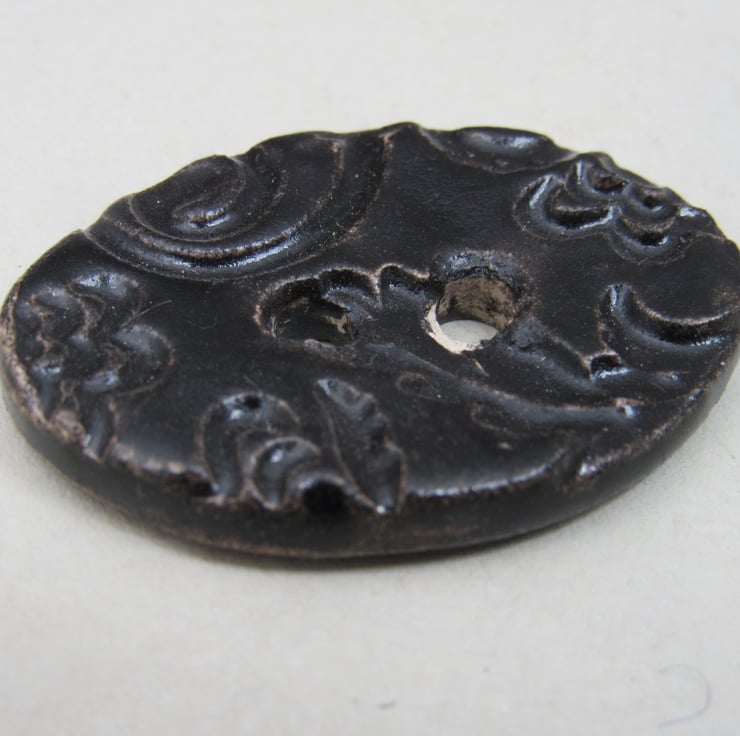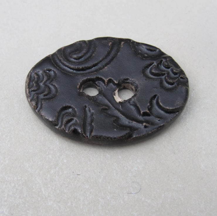 Medium oval shaped stoneware button, textured with a pretty brocade motif.