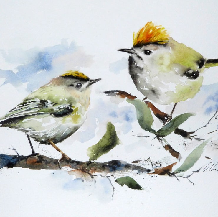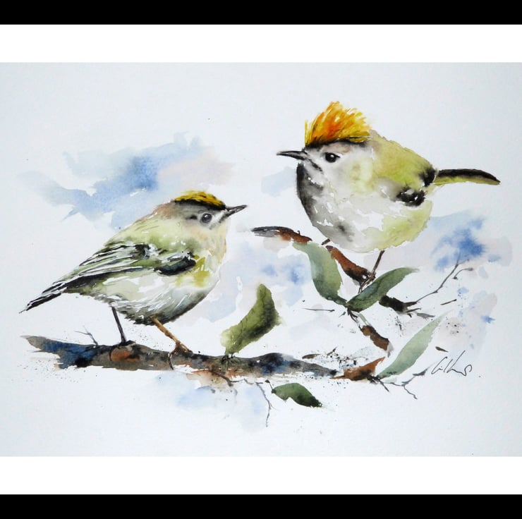 Working from my home studio on the beautiful Isle of Mull off the west coast of Scotland, my paintings are inspired by the wonderful Seascapes, Landscapes and Wildlife that surround me. This painting is of a pair of Goldcrest, a commission painting.