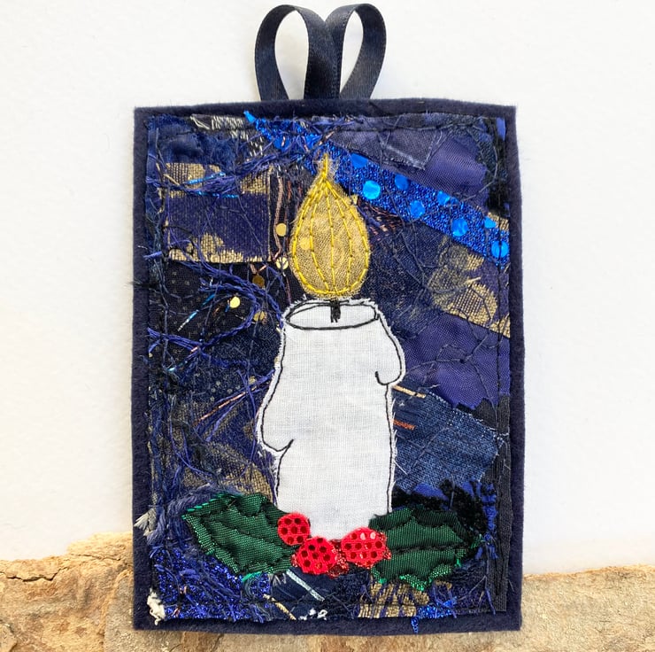This traditional embroidered candle Christmas decoration shows a lit candle framed by a deep blue background and Holly around the base. It has been made from up-cycled fabrics and stitched down with free motion embroidery. It comes felt backed and measure approx 11 x 8cm, with the ribbon the length is 17.5cm.