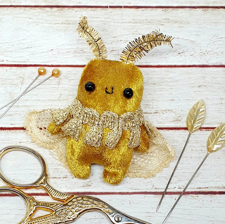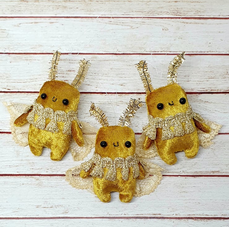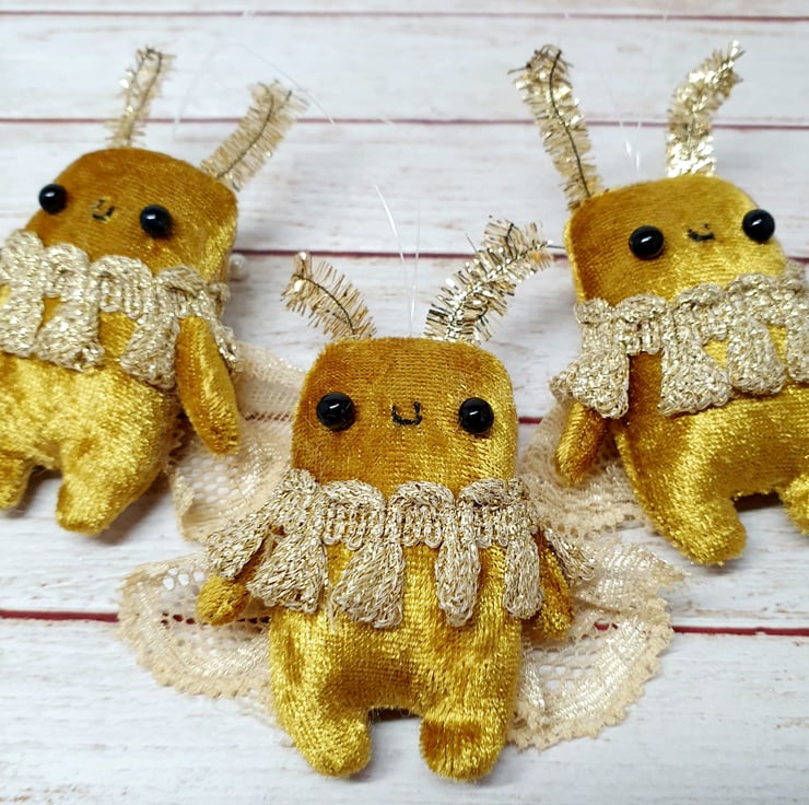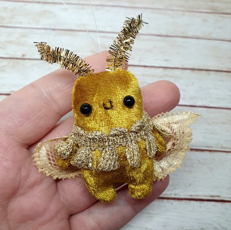 Tiny Art Doll decoration made with gold velvety fabric and glass bead eyes. This tiny moth has mini tinsel antenna and lace wings. Moth also has vintage trim around the neck and hand embroidered smile. Comes with transparent loop hanger.