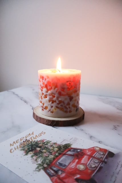 Pleased to introduce a cylinder pillar candle made from olive wax, elegantly adorned with baltic amber pieces. As the flame comes to life, this unique candle transforms into a mesmerising natural lantern. The scattered amber pieces catch and amplify the dancing light, creating a constellation of golden points that shimmer across your space