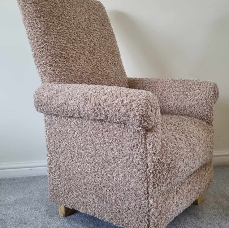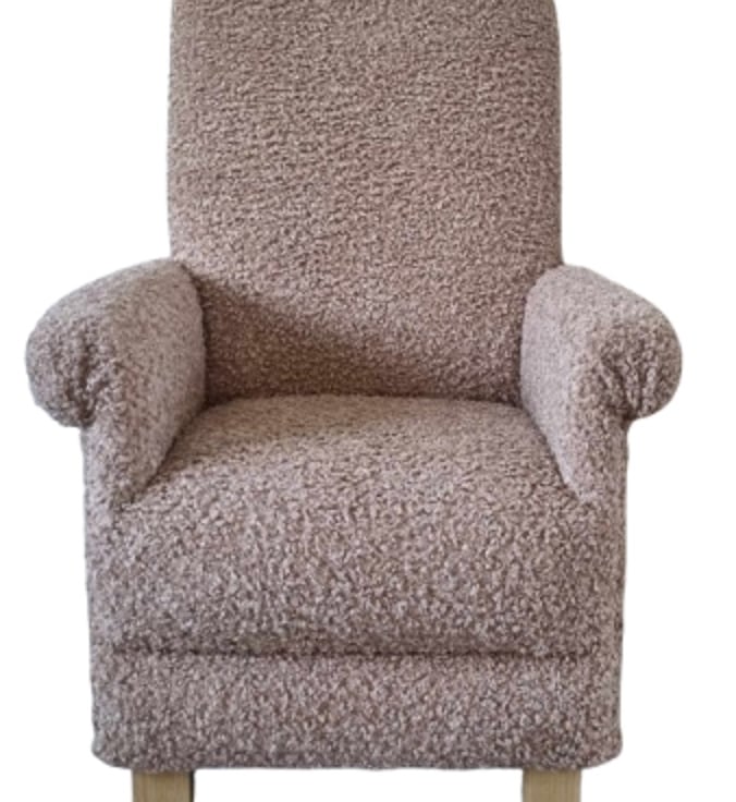 This is a handcrafted, sturdy adult sized armchair, which has been made by myself, a professional upholsterer with over 32 years experience, using Brown Boucle fabric.