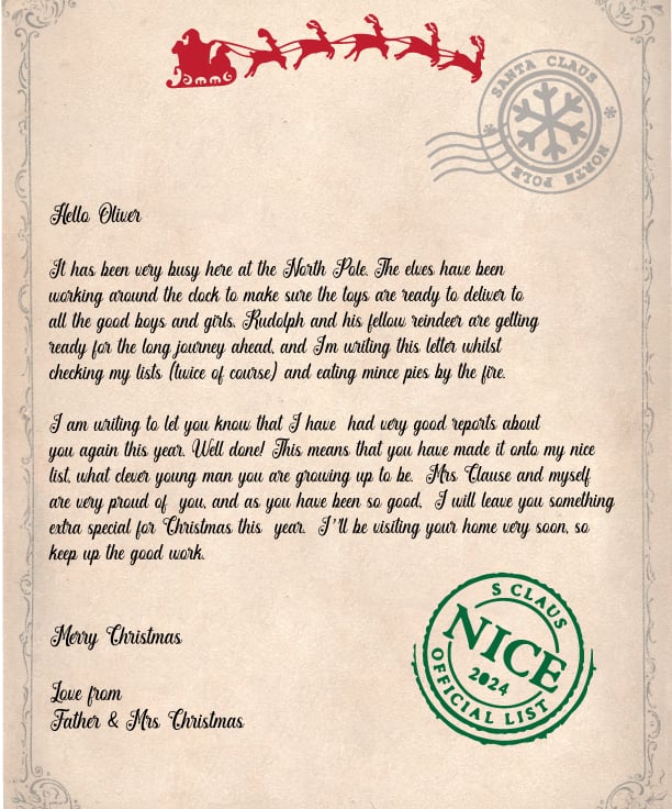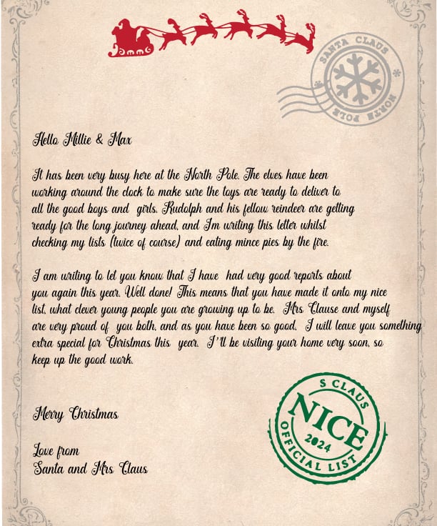 These authentic looking prints were created to make Christmas magic, doubly magical. Straight from the North pole to whoever you choose to name in the letter. Each letter is A4 sized and printed using eco friendly inks. Please state names to be included when placing your order and any other information you'd like to be added e.g. Oliver is on the nice list because he is so kind and thoughtful. Authentic envelope included.