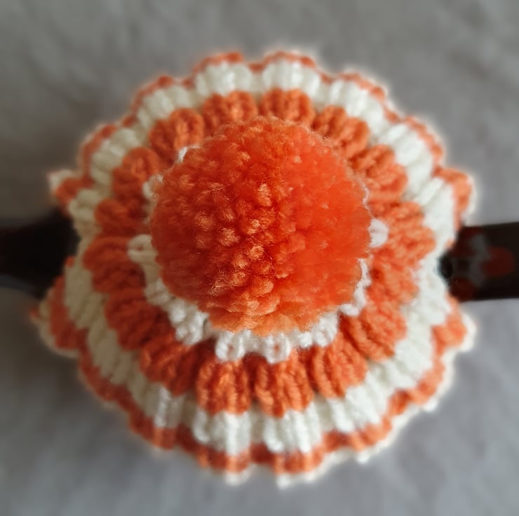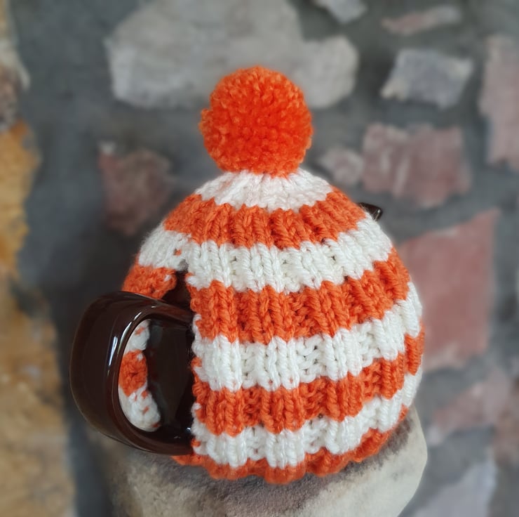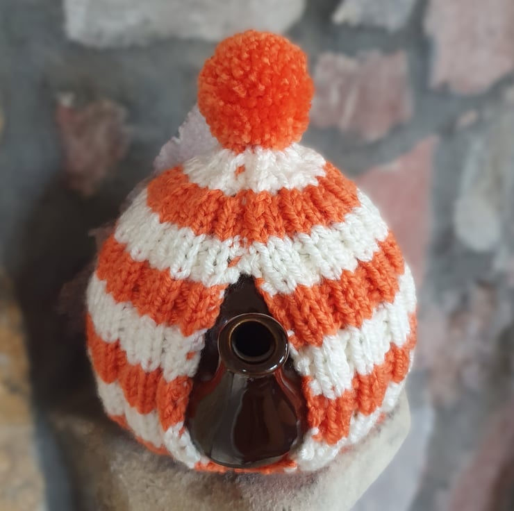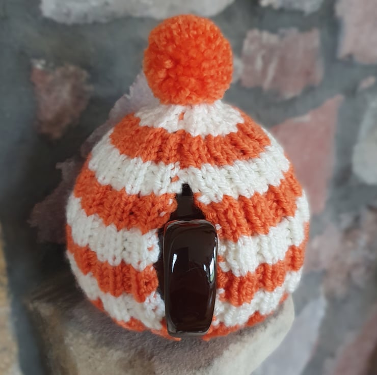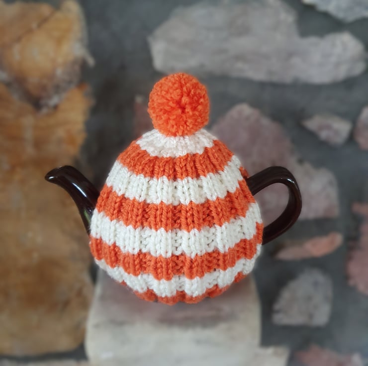 Vegan Friendly Small Cornish Striped Tea Cosy for 2 Cup Tea Pot, Orange and Cream/Ecru, Hand Knitted