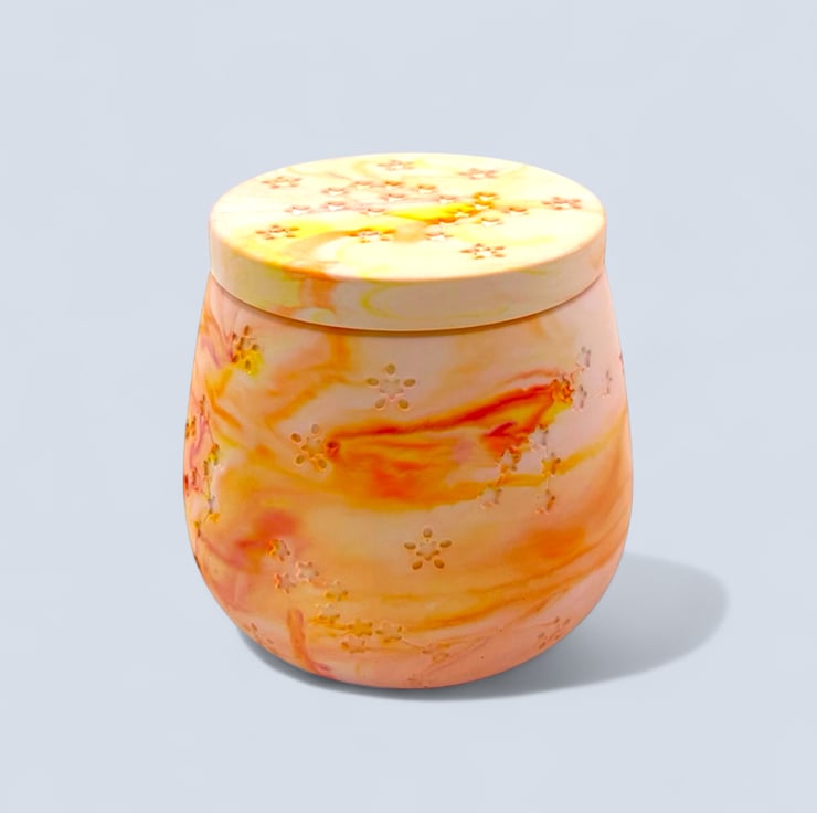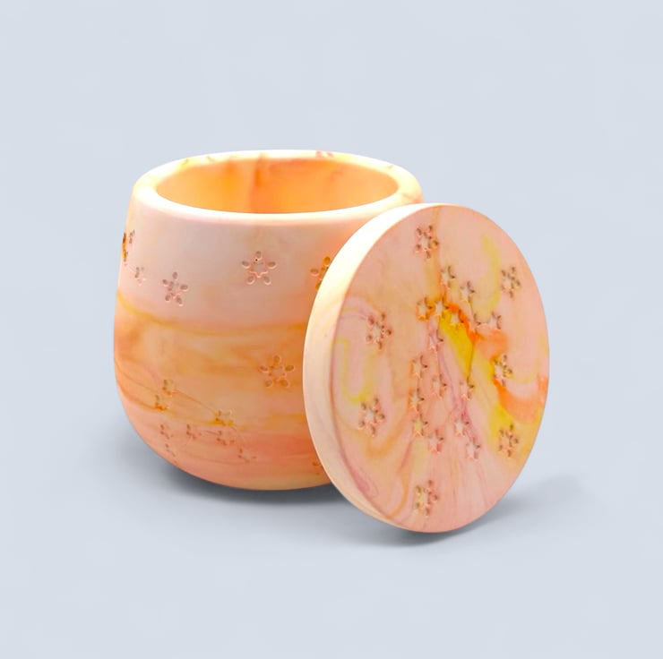 Peach sunset jewellery box with star and constellation detail, handmade in warm shades of orange, yellow and red. This small decorative jewellery box is perfect for storing rings, earrings and tiny keepsakes, and it can also be used as a candle jar for tealights or small votive candles. The lid can then be used as a coaster to help protect surfaces from heat. It makes a thoughtful gift for anyone who loves colourful, handmade home decor.