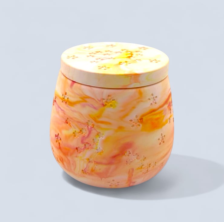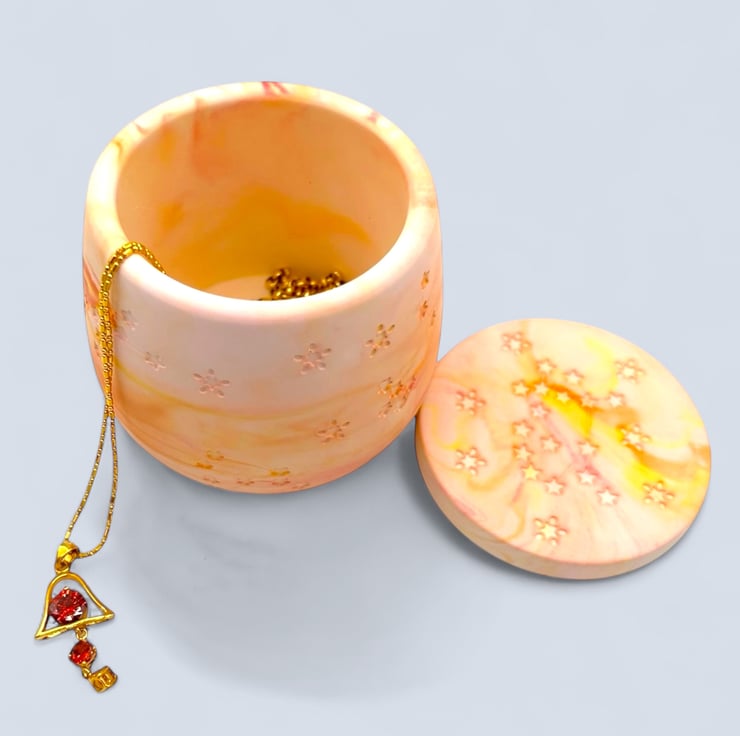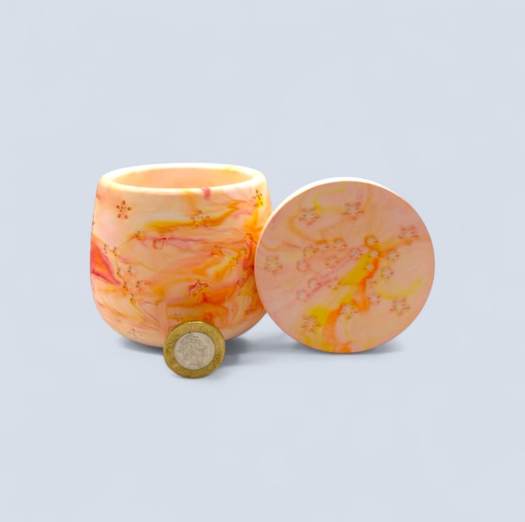 This design was inspired by the soft glow of a peach-toned sunset, when the sky shifts through warm shades of orange, gold and blush before fading into dusk. The marbled colours flow gently around the box like evening light across clouds, while the tiny star and constellation details reflect the first stars appearing as day turns to night. It captures that quiet, golden-hour moment in a small decorative piece you can keep close.