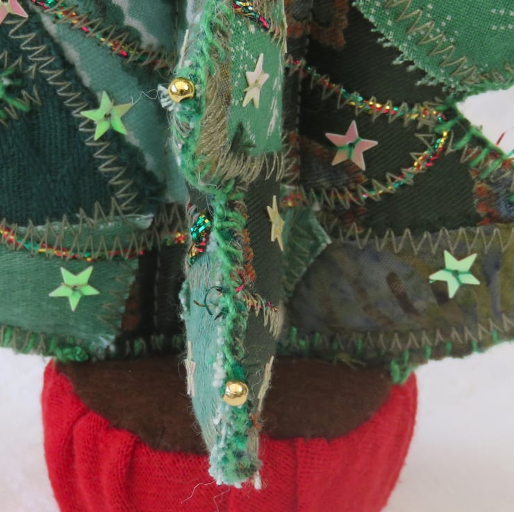 Fabric scraps in shades of green have been randomly appliqued to Christmas tree shapes in green felt to give a patchwork appearance. Pretty metallic cord has been added to represent tinsel. The tree has been decorated with tiny pearlescent sequin stars, which catch the light beautifully, carefully stitched in place. A star of gold sequins and beads sits on the top of the tree. Tiny gold beads have been stitched to the end of each 'branch'. The sections of the tree are gently filled with wadding. The tree is 'planted' in a festive red tub, constructed from a recycled plastic bottle top, covered in recycled T-shirt fabric. The tub is filled with polyester wadding and brown felt is stitched over the top. The tree is firmly stitched in place.