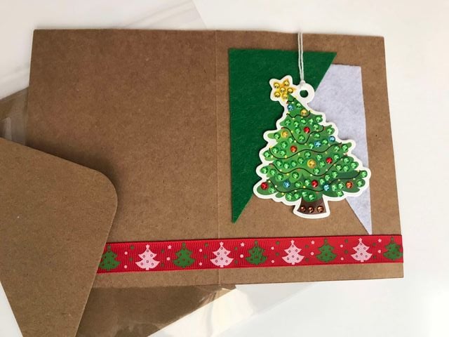 Christmas decoration diamond art with green-white felt glutted to a brown card. The measures are 21x14.5 cm when unfolded. Tidy finishes. The decoration can be gently removed and hung on the Christmas tree.