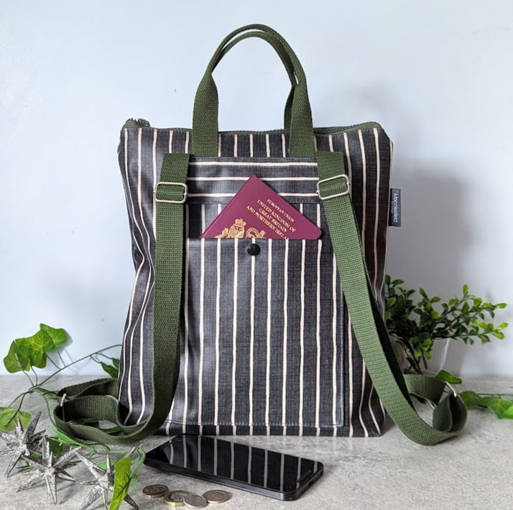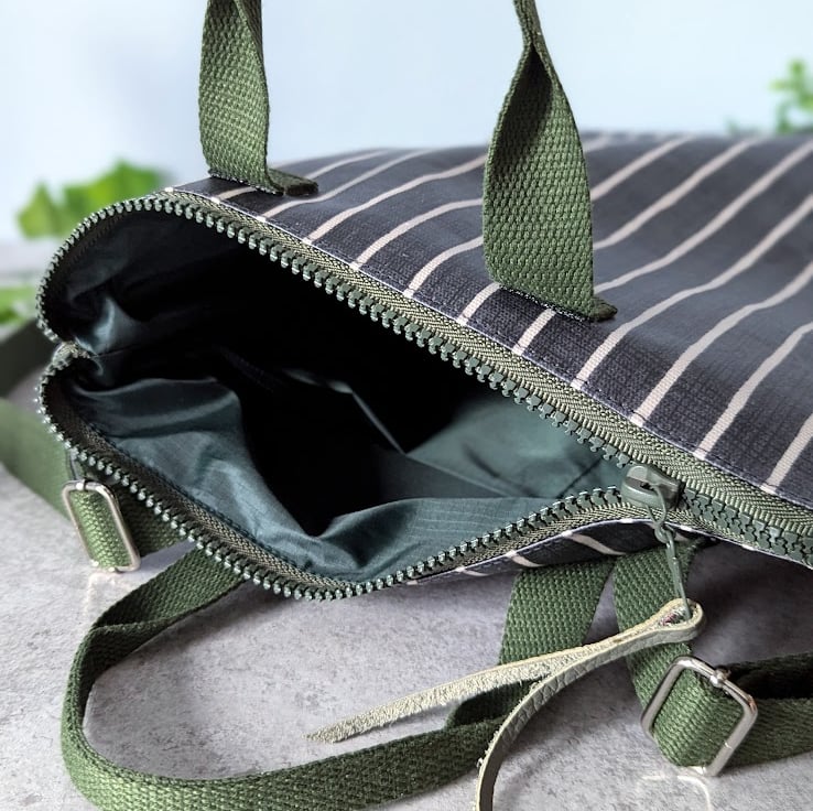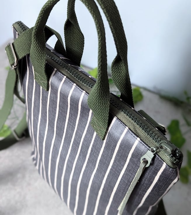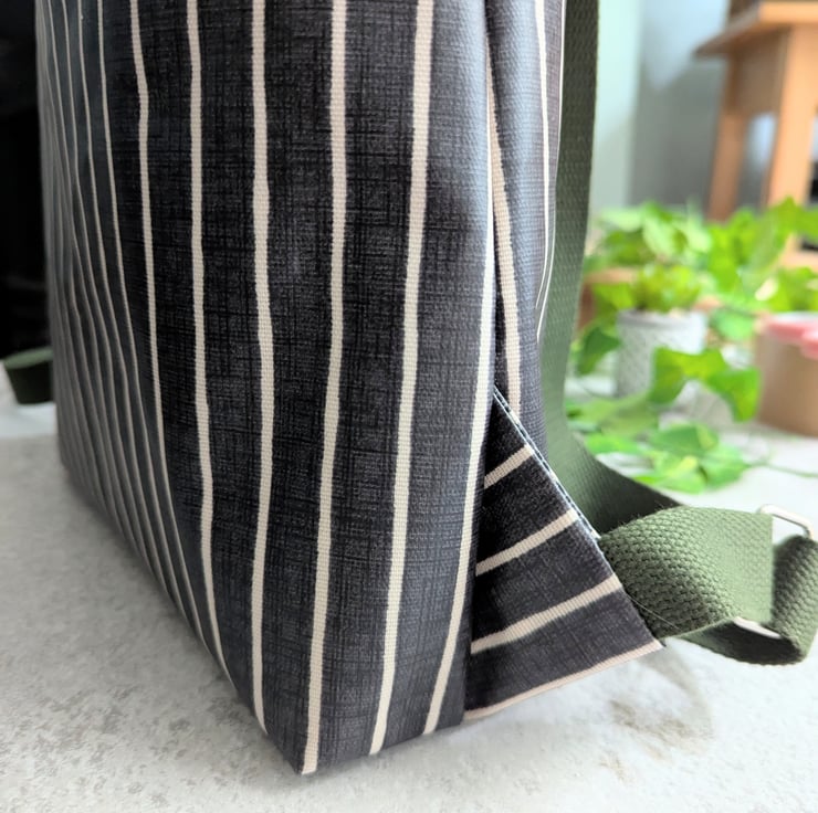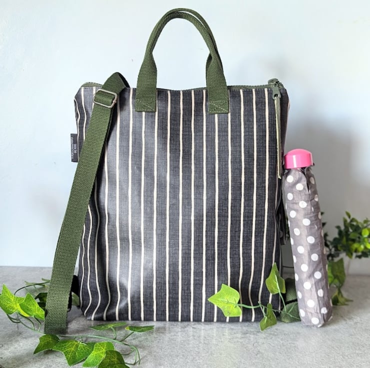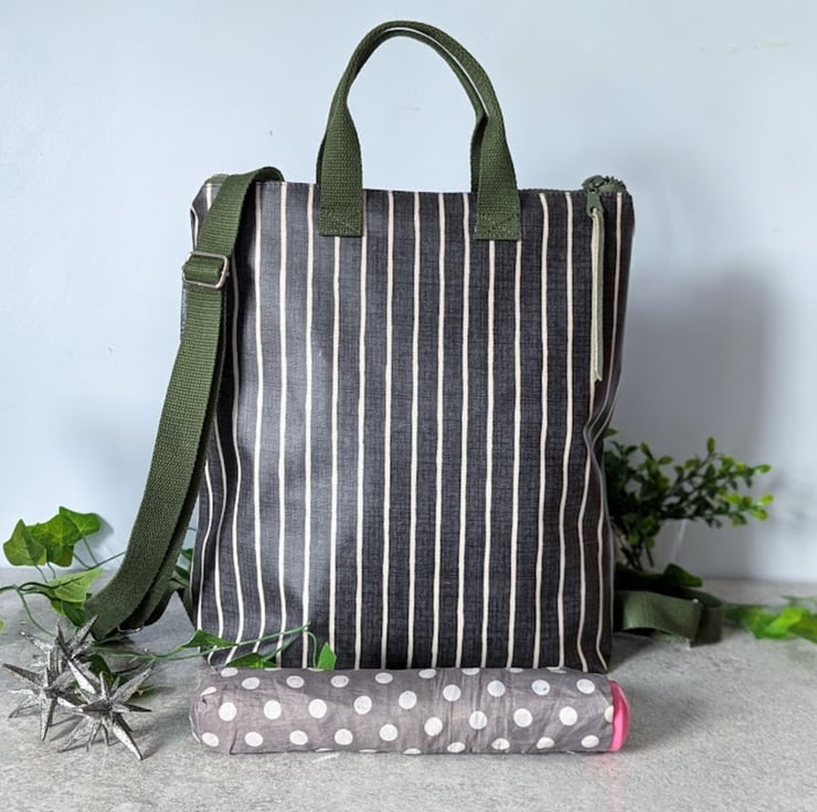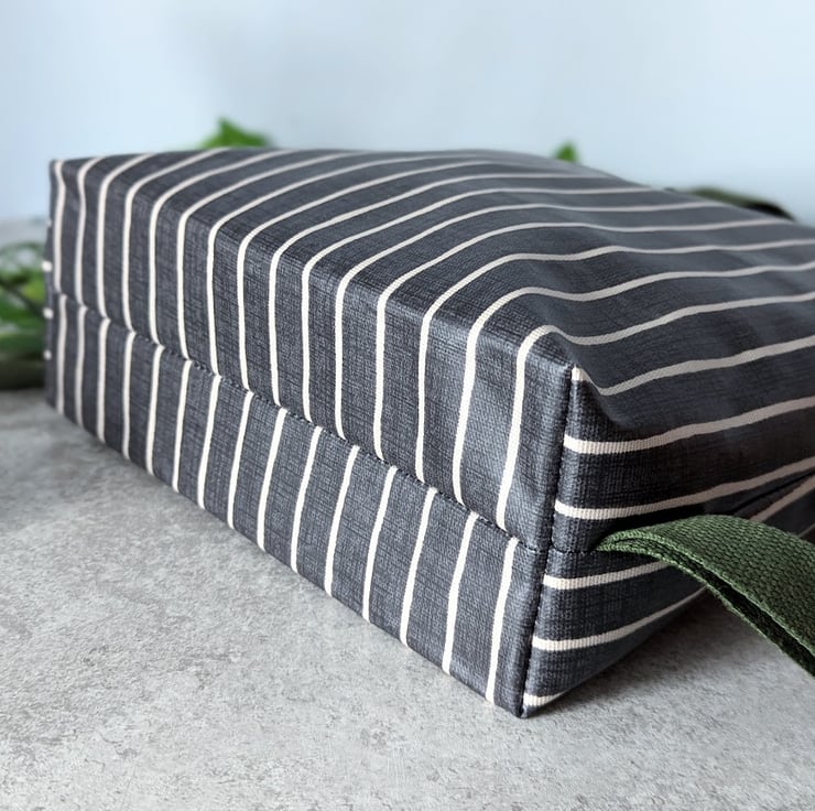 Handmade using a dark grey grey striped matt PVC coated cotton (oilcloth), it has a zipped top and is lined with a dark green rip-stop nylon lining.