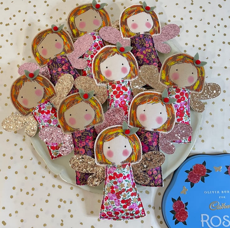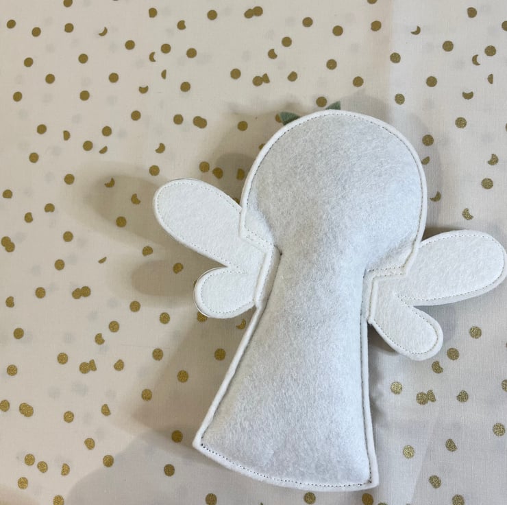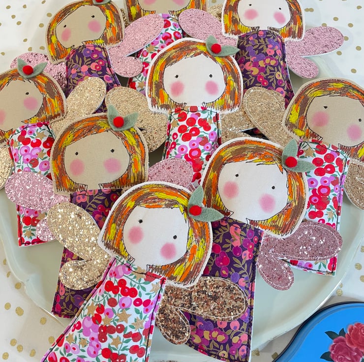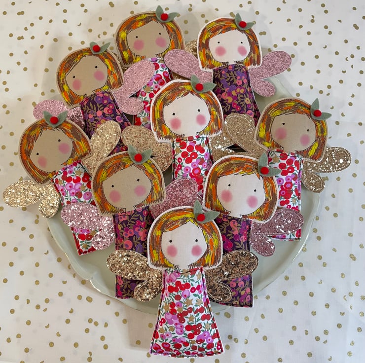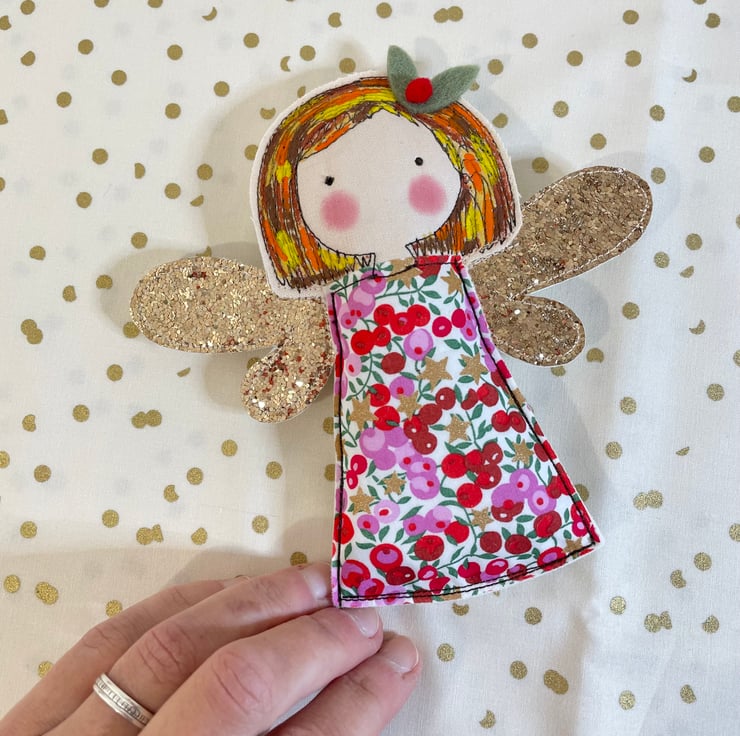 I’ve free motion embroidered the fairy (or angel, your call!) complete with a pretty Liberty dress, sparkly wings, festive adornment in her hair and rosy cheeks. The fairy is 100% filled with lavender and is backed with natural wool felt.