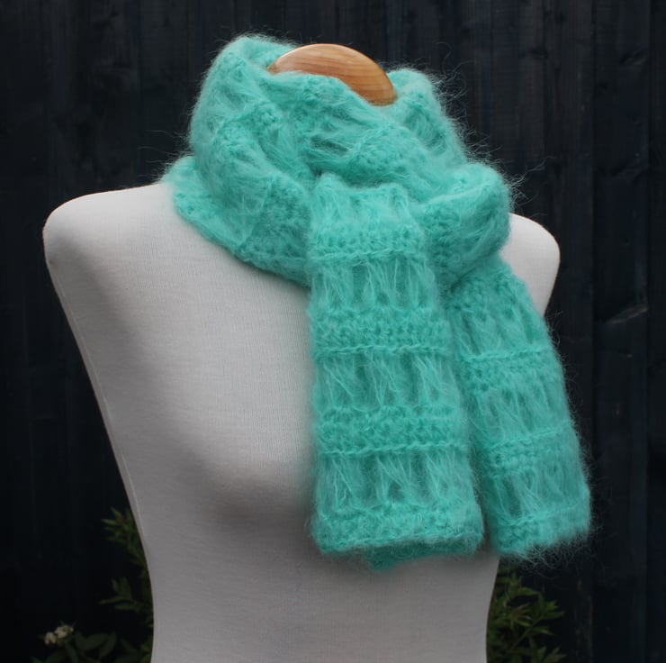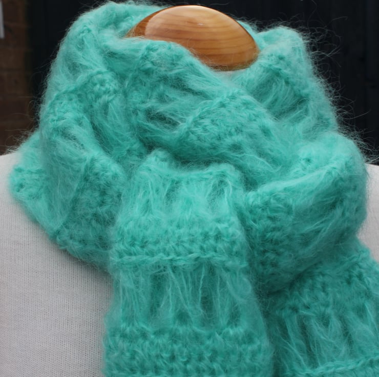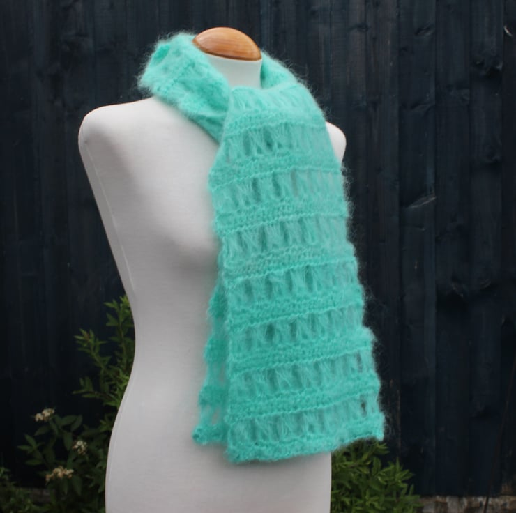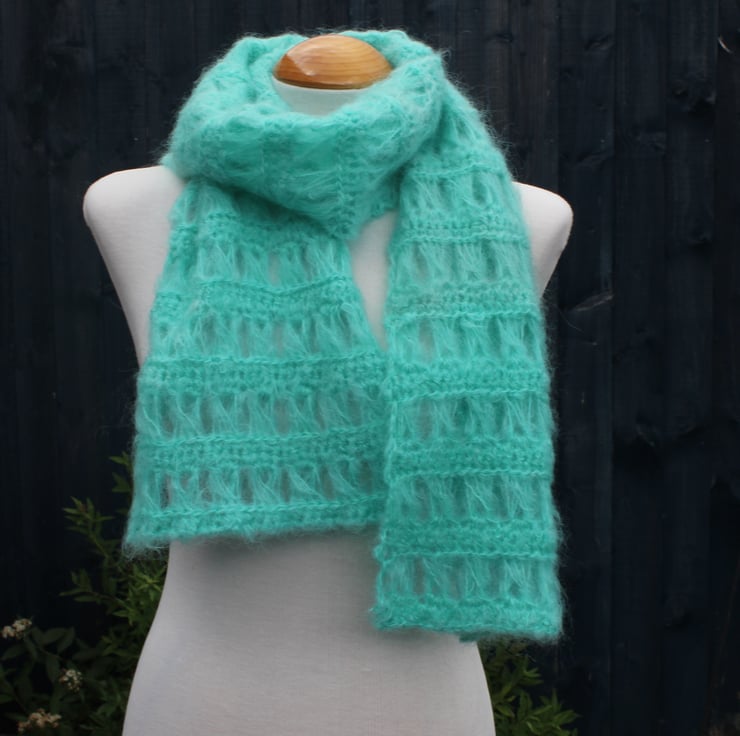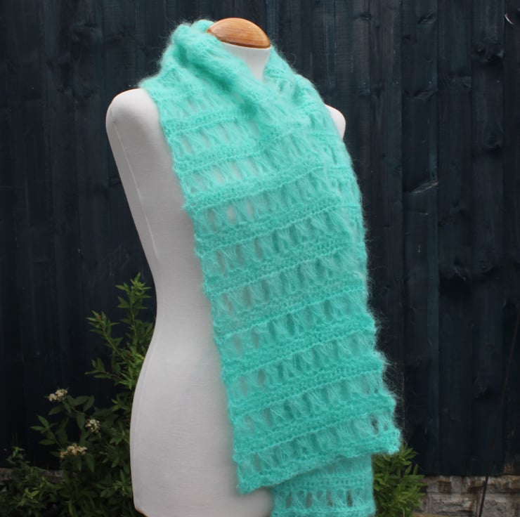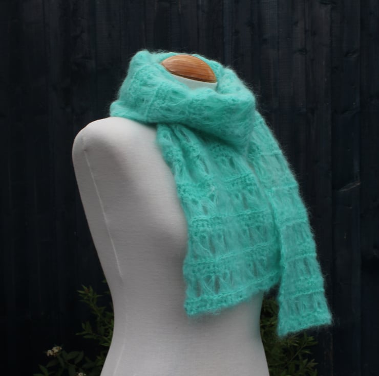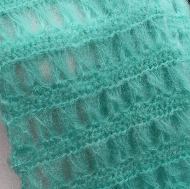 If you would like to see more photographs and read about how this scarf was made please visit my blog post about it. https://drapedinlacebyjuliablakeman.blogspot.com/2024/09/aqua-mohair-broomstick-lace-scarf.html