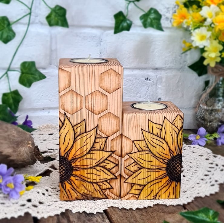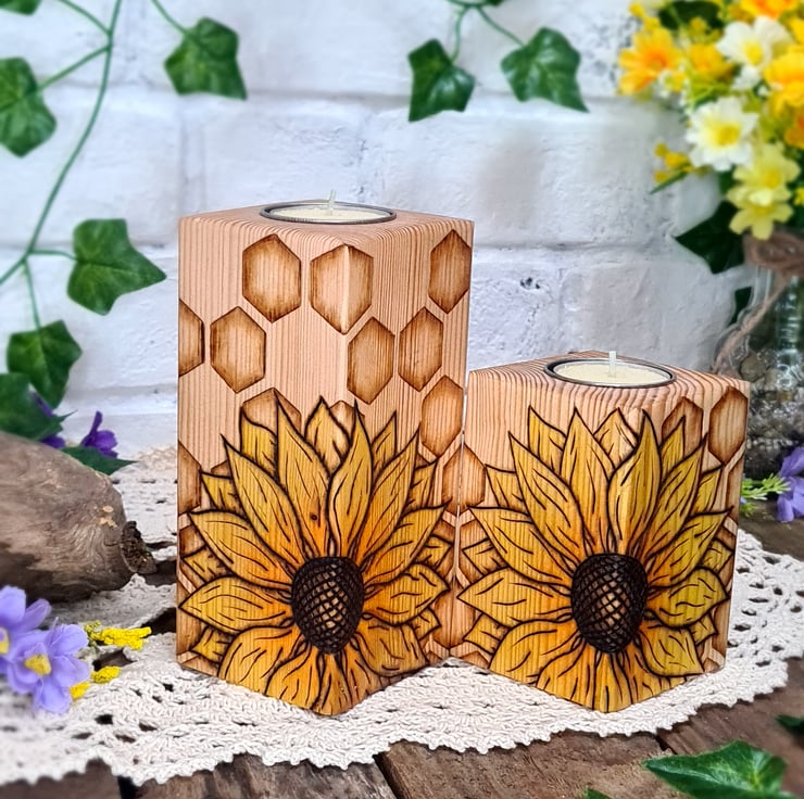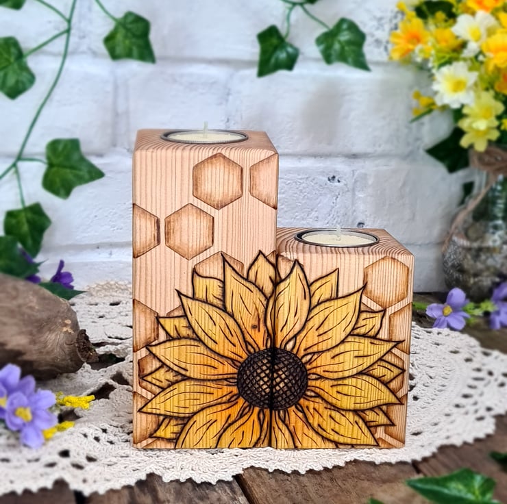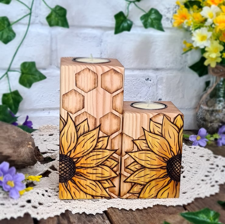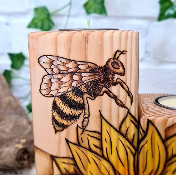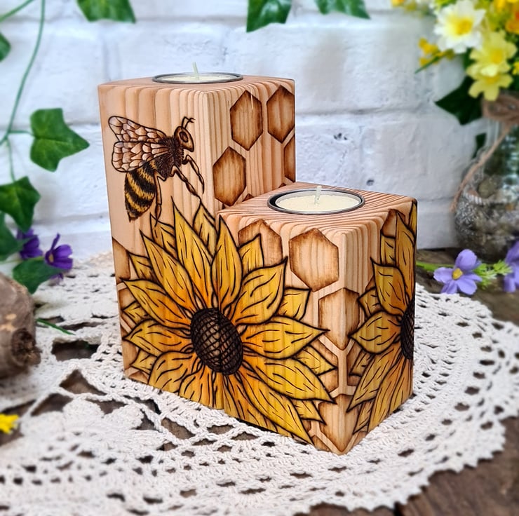 Pyrography is used to hand burn a floral bee design onto all four sides of each holder, various designs can be displayed depending on the position of each holder, with the addition of metal inserts to house two standard sized tealights, and a touch of colour, all together makes for a unique piece