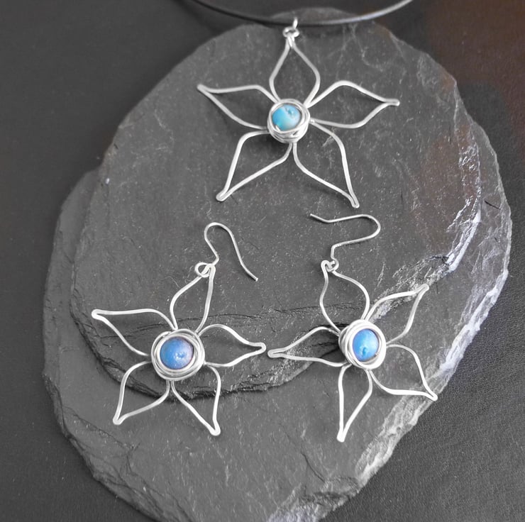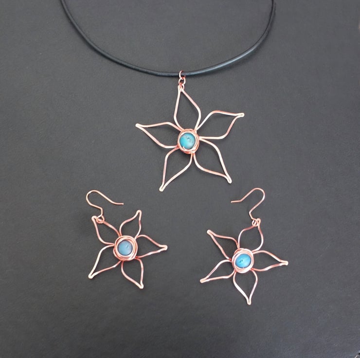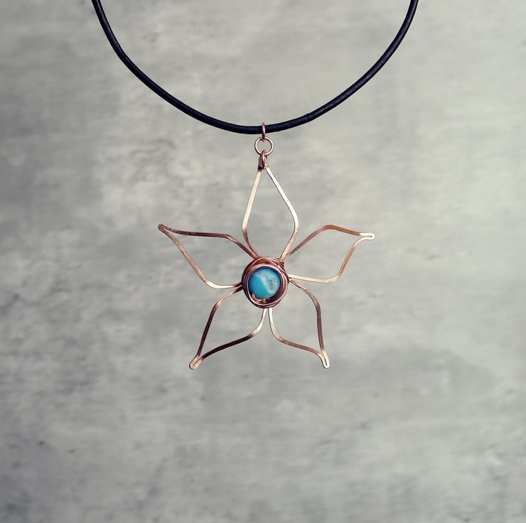 Wire flower necklace. Made from copper or silver with a matte turquoise blue druzy sparkly Agate bead. Bead can be changed to one of your choice, price may change.