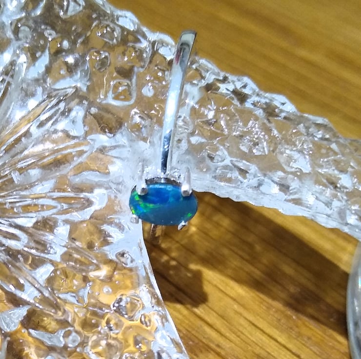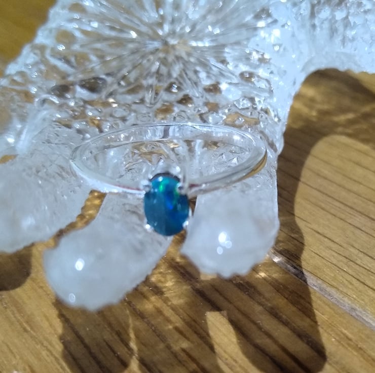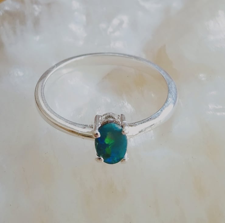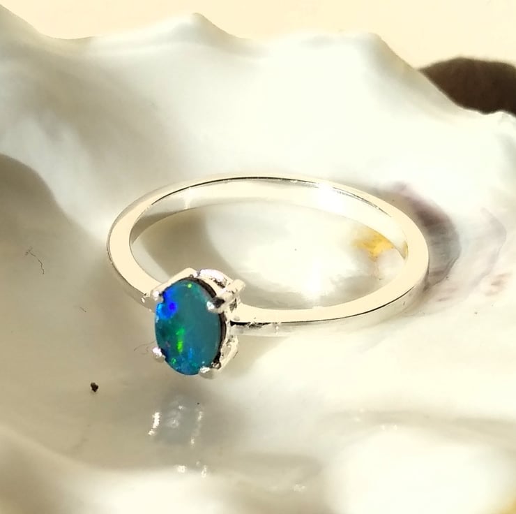 This ring is all about the amazing genuine 0.65ct Australian crystal opal slice on ironstone, 6x4mm oval, with an azure blue colour and vibrant flashes of green. This smooth opal cabochon is prong set into a dainty 925 sterling silver ring size P-Q ( size 8 or size 56.5).
