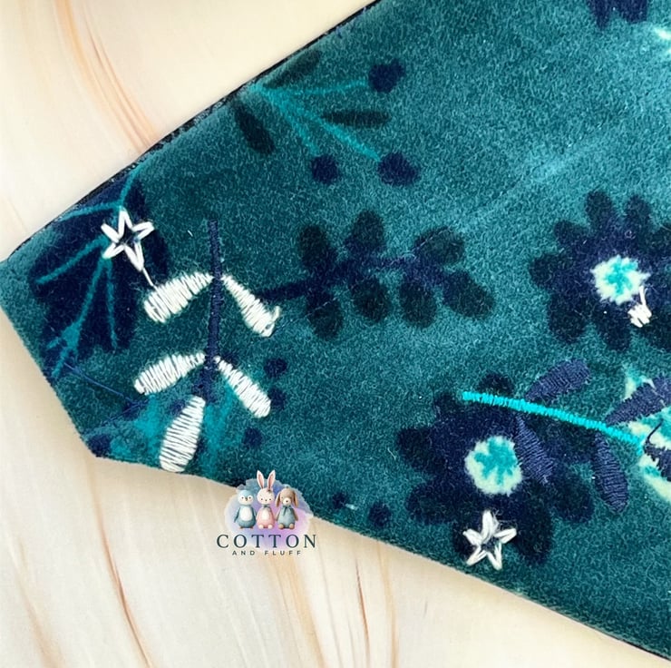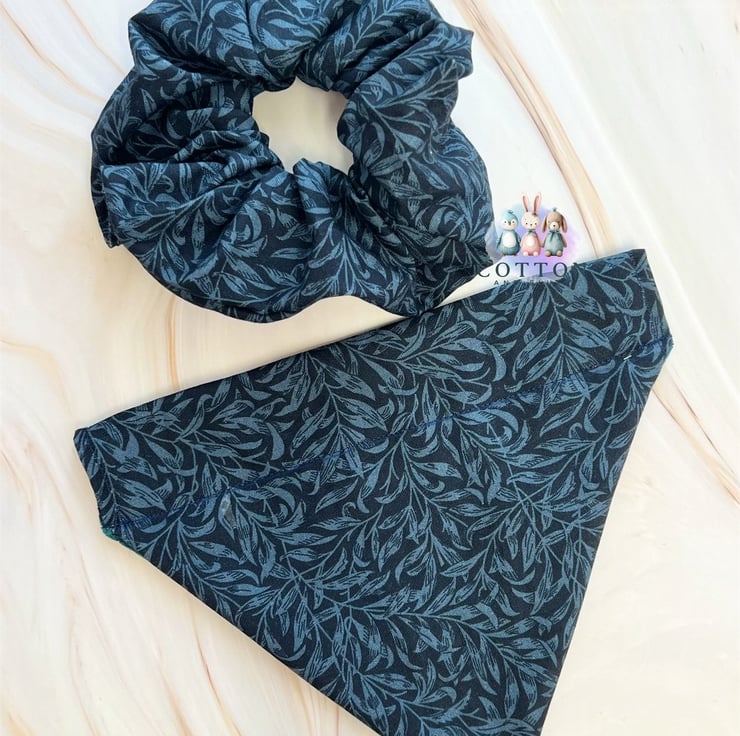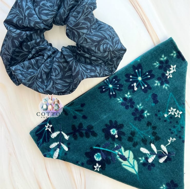 Such a pretty bandana and scrunchie bundle with an autumn feel. Soft luxurious velvet with embroidery detail. At Cotton and Fluff we are committed to love our pets back by making bandanas safe, sustainable and unique.